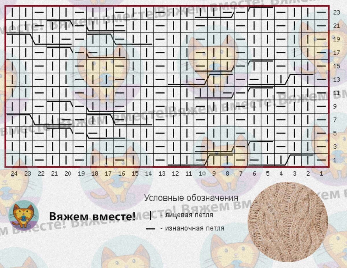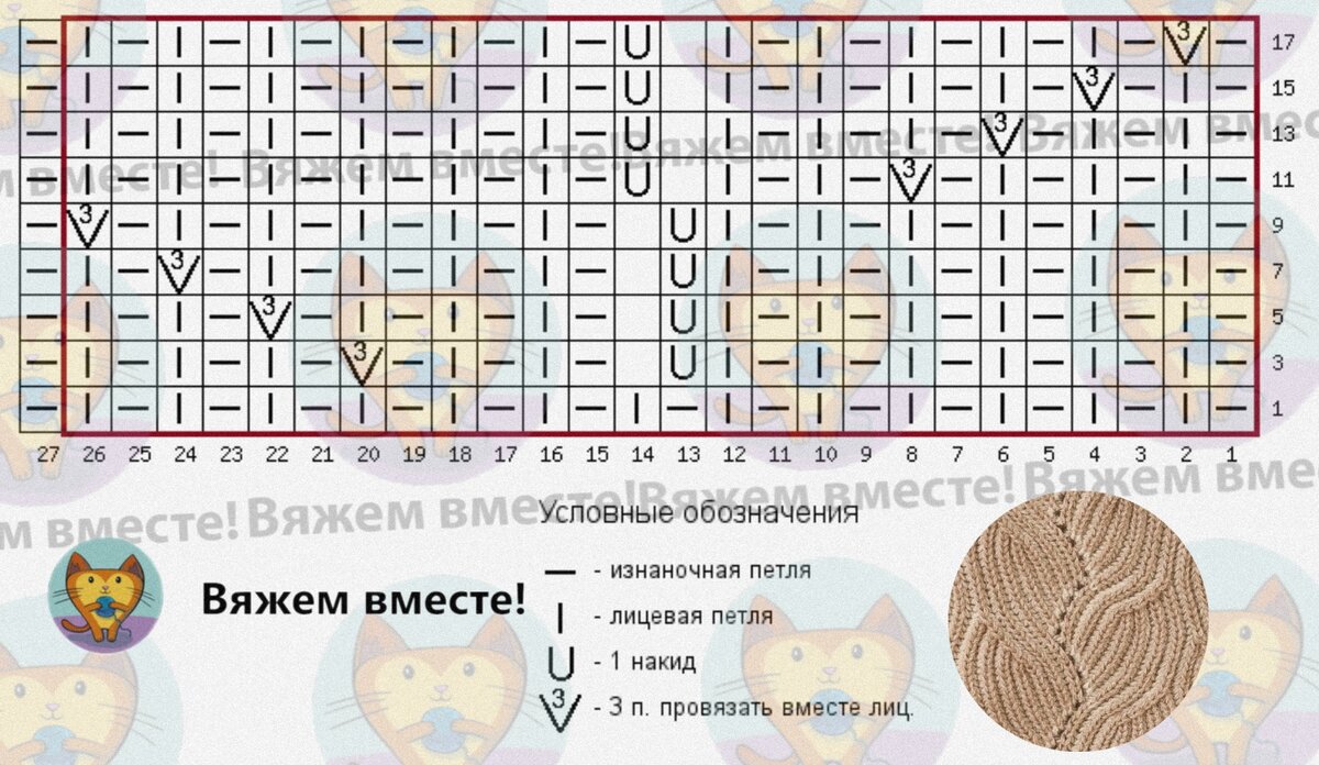 Первый ряд схемы установочный, но невзначай попал в рамку раппорта. При вязании узора прошу его не учитывать, по сути это обычная резинка 1x1, которой вяжется низ изделия.