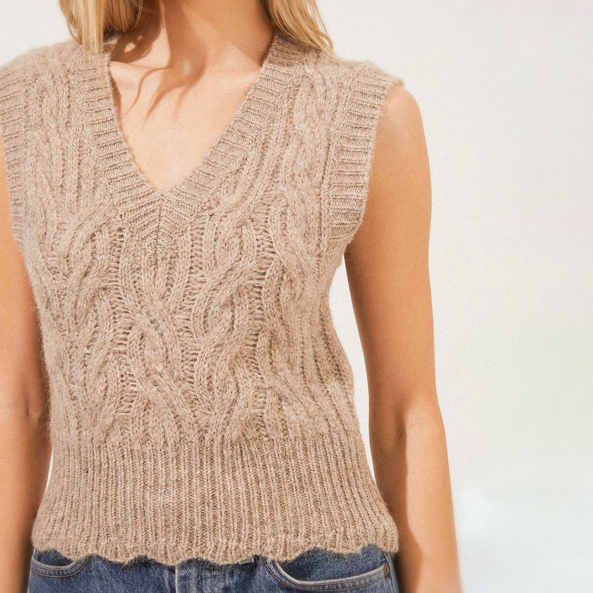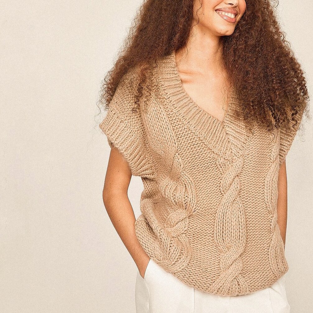 Красивая бежевая безрукавка с косами от бренда NA-KD, выполненная из толстой пряжи. Задумка и исполнение красивые, но за счёт объема подойдёт далеко не всем.