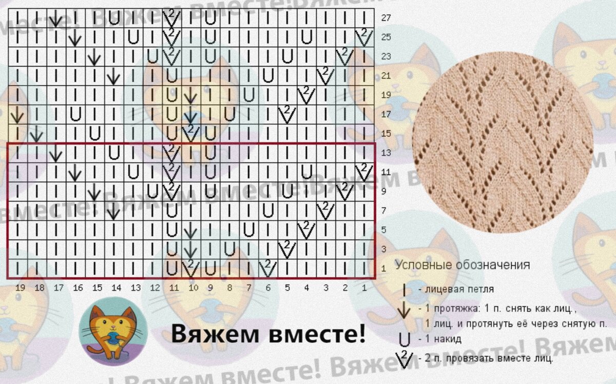 Раппорт равен 19 петлям и 14 рядам, обозначен красной рамкой на схеме.