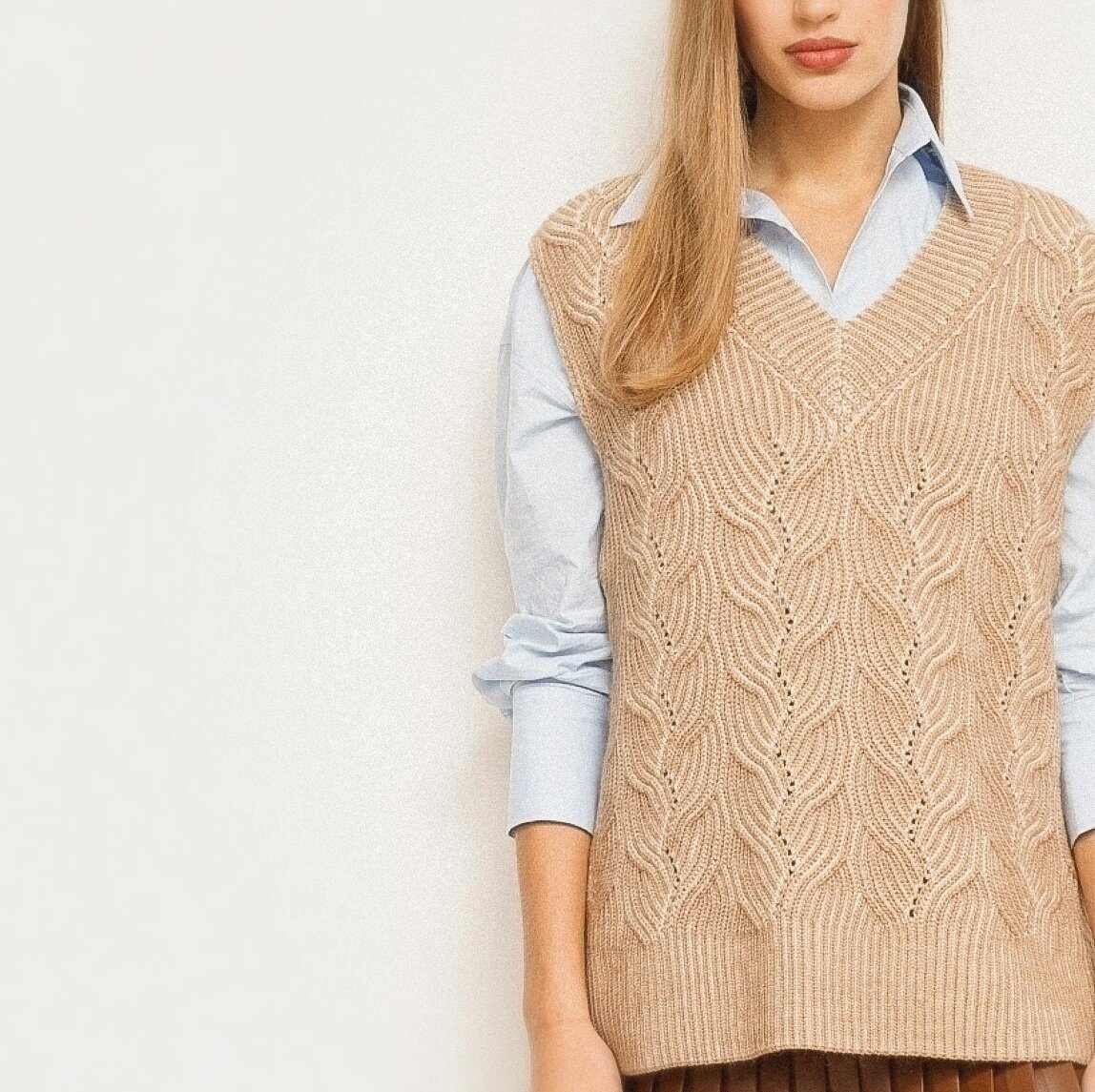 Первая модель — безрукавка классической посадки с V-вырезом горловины и широкой резинкой по низу. Так как модель слегка укороченная, то резинка начинается уже в области талии, делая акцент.