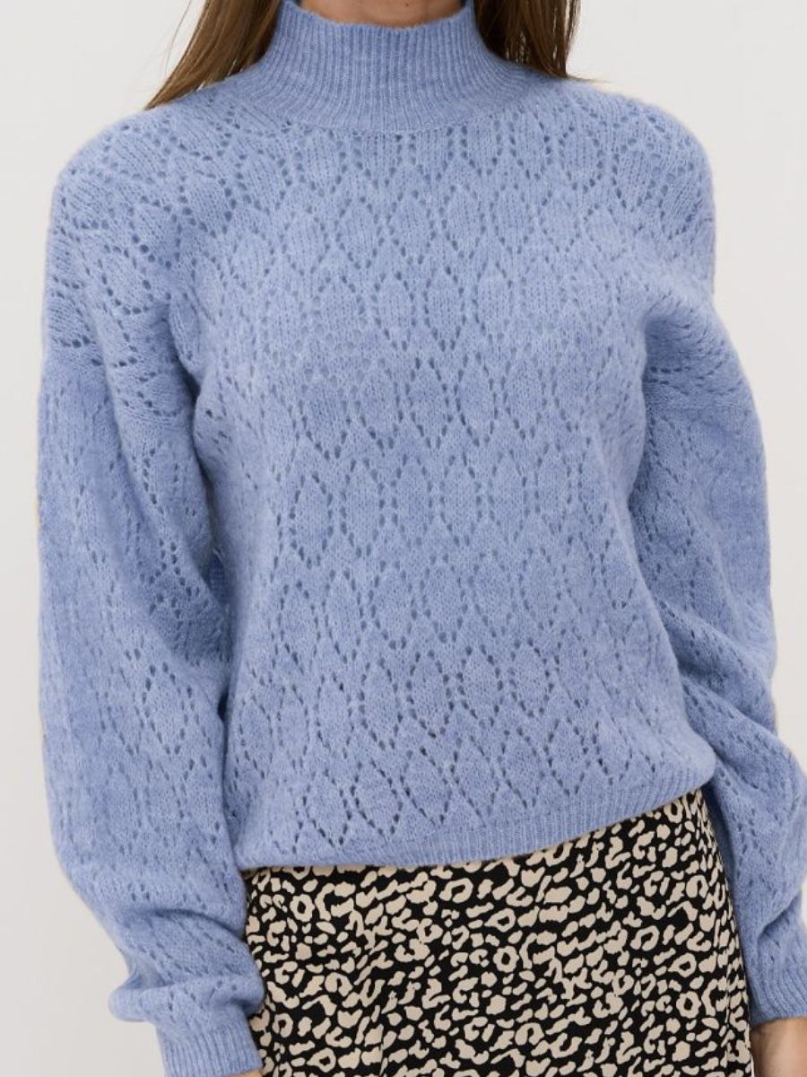 В модели лазурного цвета ажурные ромбы чередуются с ромбами, заполненными платочной вязкой.
