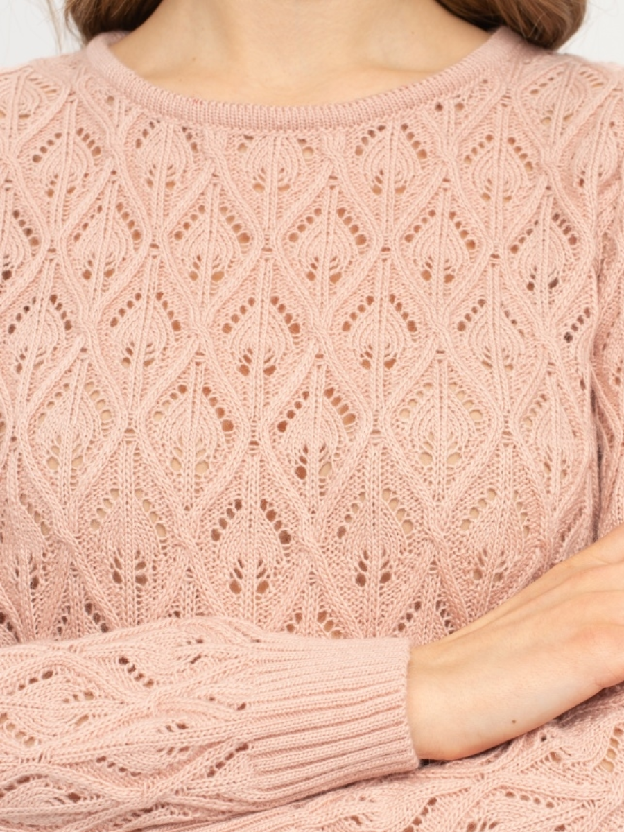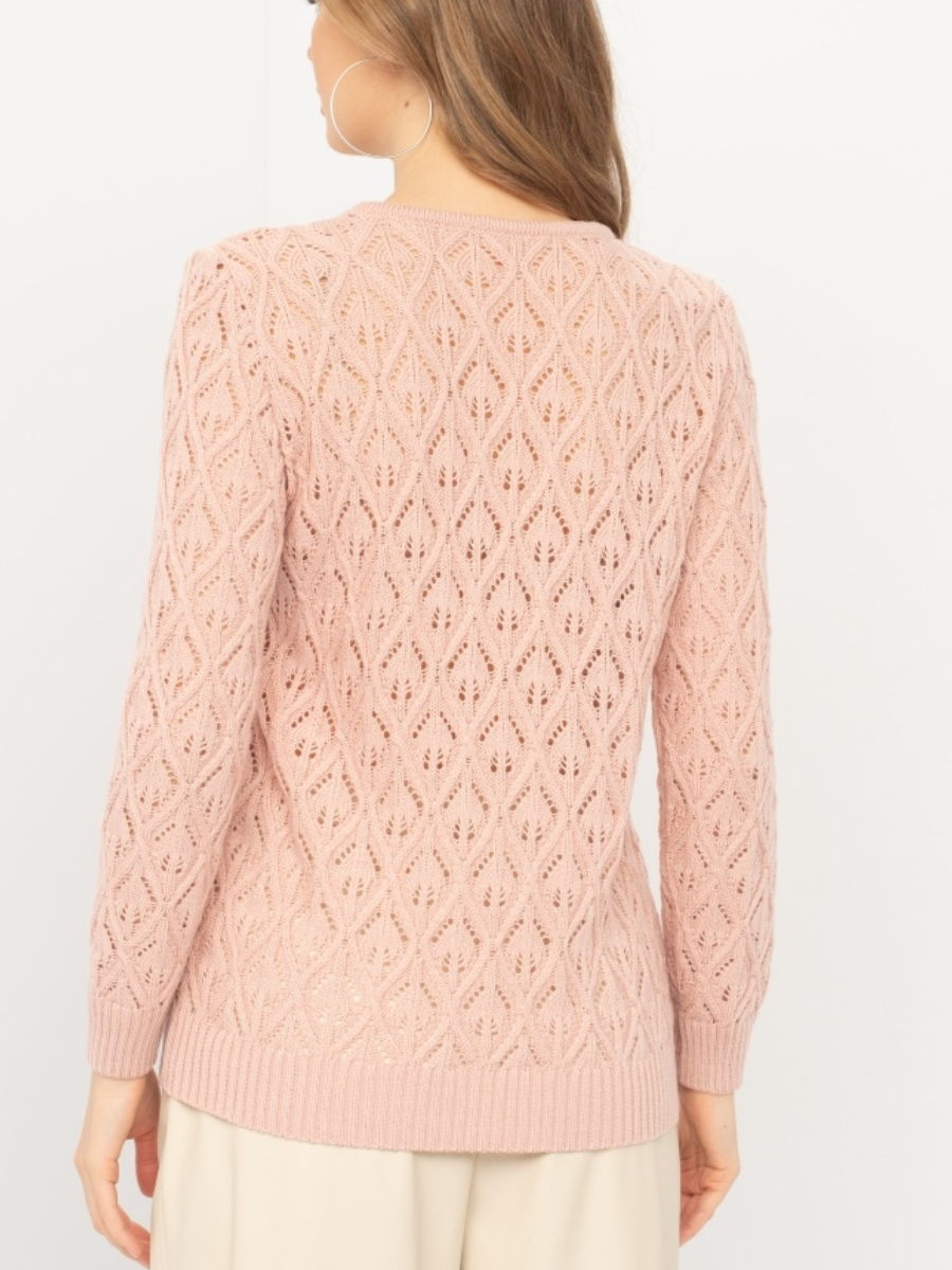 В этой модели пудрового цвета - приятный ненавязчивый узор из листьев, которые вывязаны в ромбах. Растительные узоры сейчас набирают популярность, их стали часто задействовать в своих коллекциях известные модельеры.
