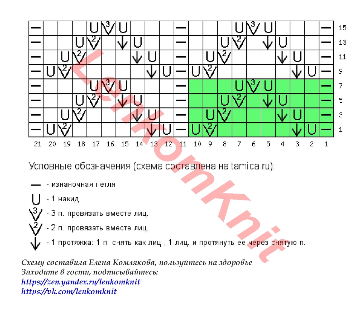 На рисунке зеленым цветом выделен раппорт узора (10 петель и 8 рядов). К схеме указаны условные обозначения.