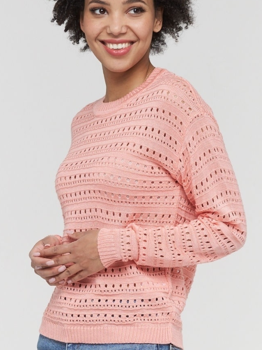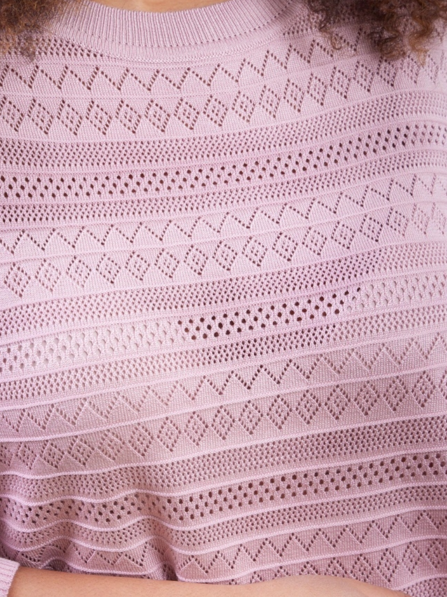 В этом свитере очень простые, но актуальные узоры - тонкие полоски из лицевой глади с маленькими и крупными дырочками. Полосы разделяют изнаночные петли.