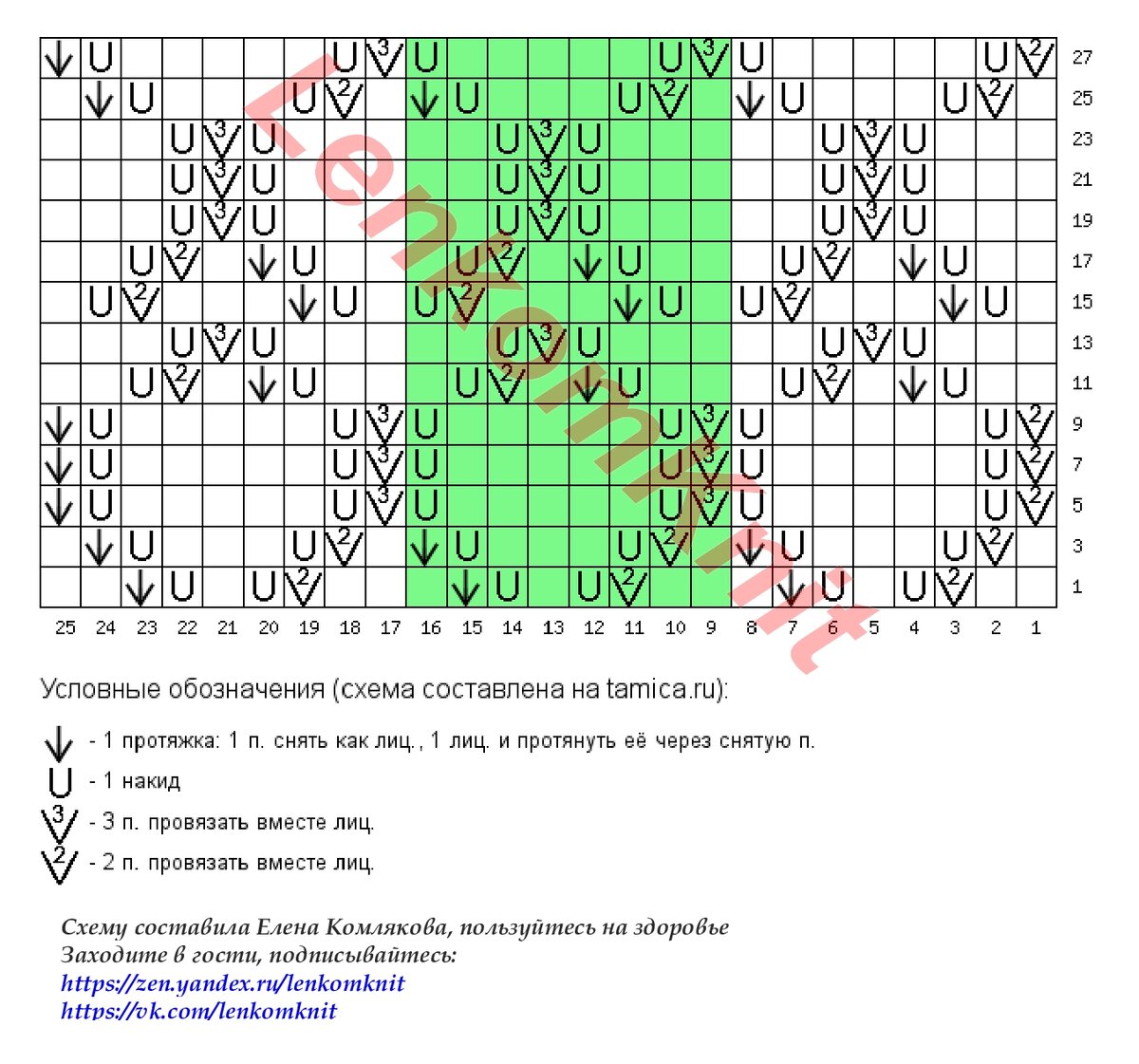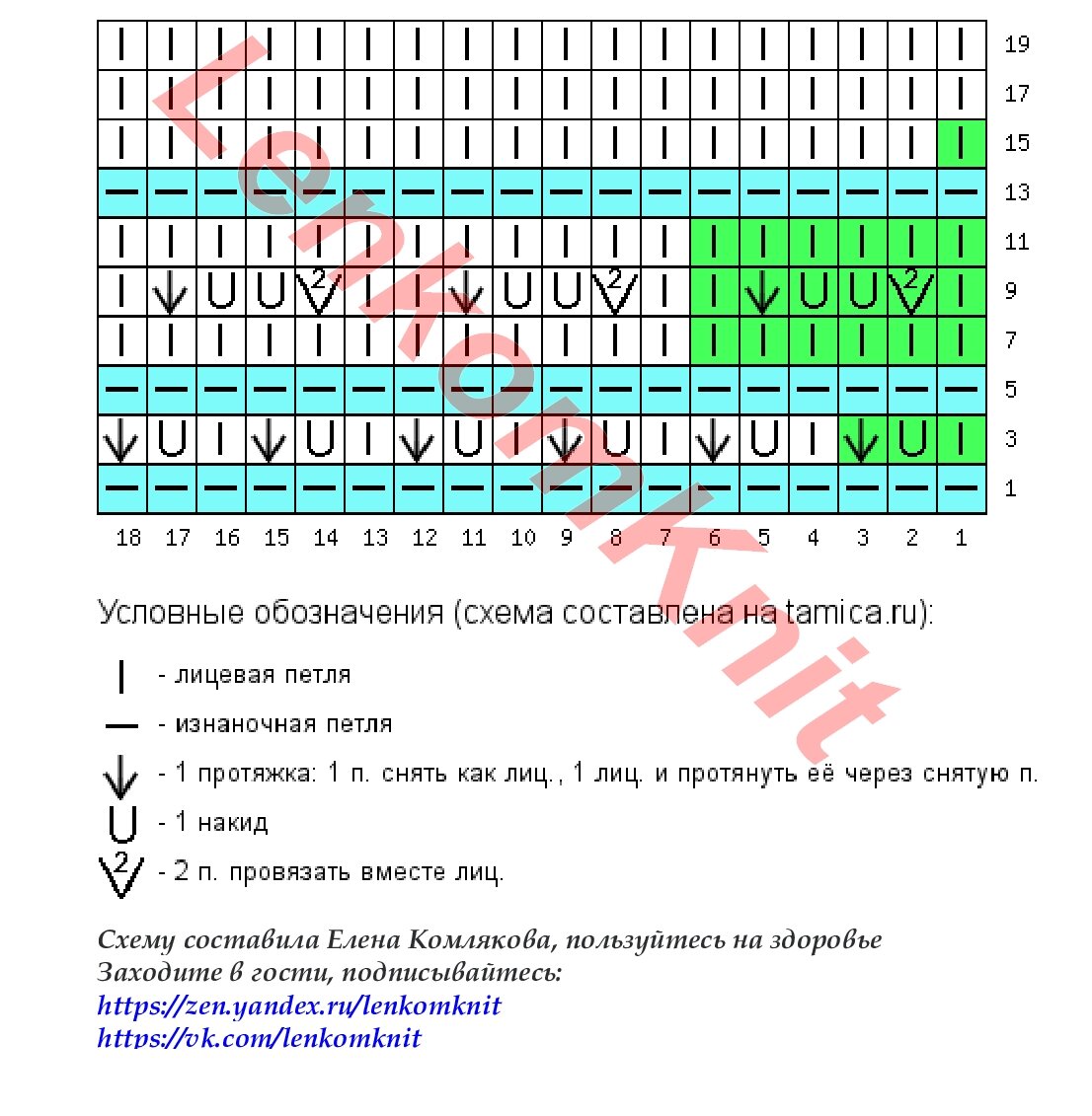 Я нарисовала схему узора и зеленым выделила раппорт. Пустая клеточка в этой схеме - это лицевая петля.