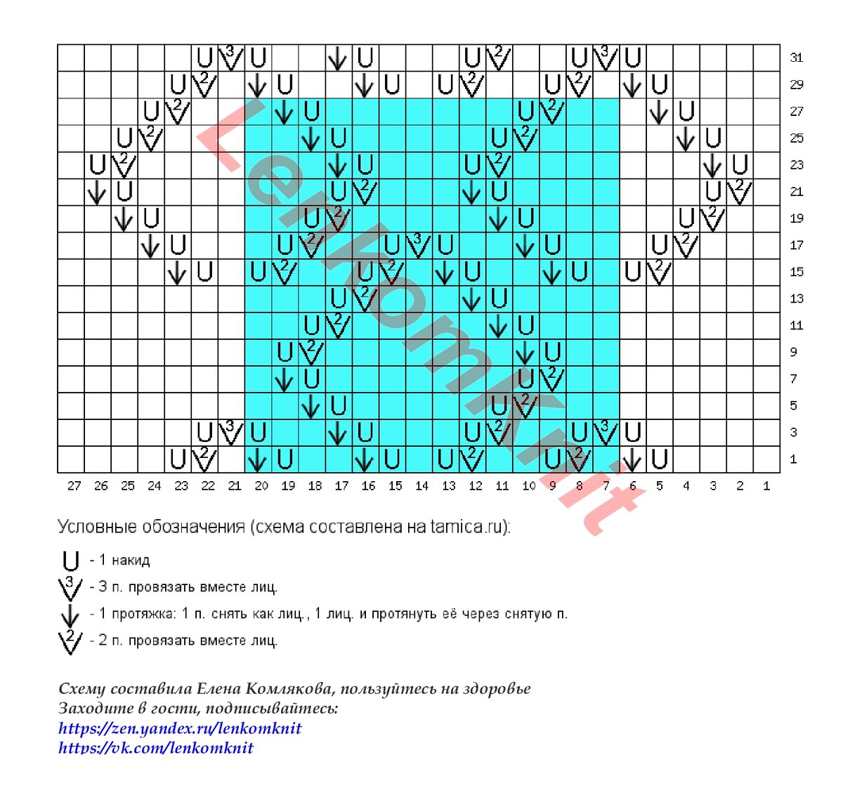 На рисунке изнаночные петли для удобства отмечены бирюзовым цветом. Маленькие дырочки на свитере получаются за счет обычных накидов. Большие дырки - это двойные накиды, в изнаночных рядах из них вывязываются две петли.