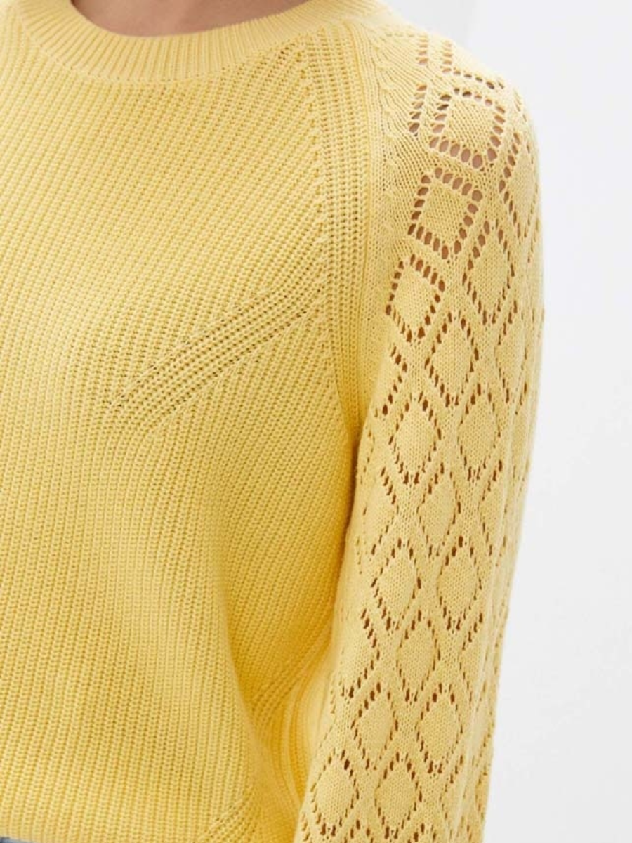 Свитер с круглым воротом и ажурным рукавом реглан. Основная часть этой модели связана полупатентной резинкой, на уровне груди вывязаны диагональные полосы (со стороны центра делается накид, затем вяжется полоса из шести петель полупатентной резинки и две петли провязываются вместе (с наклоном вправо или влево).