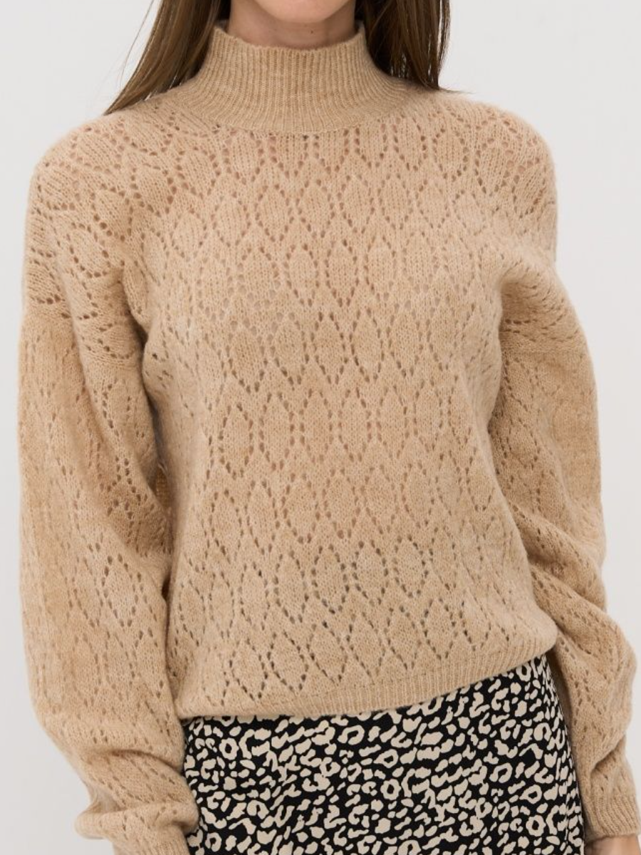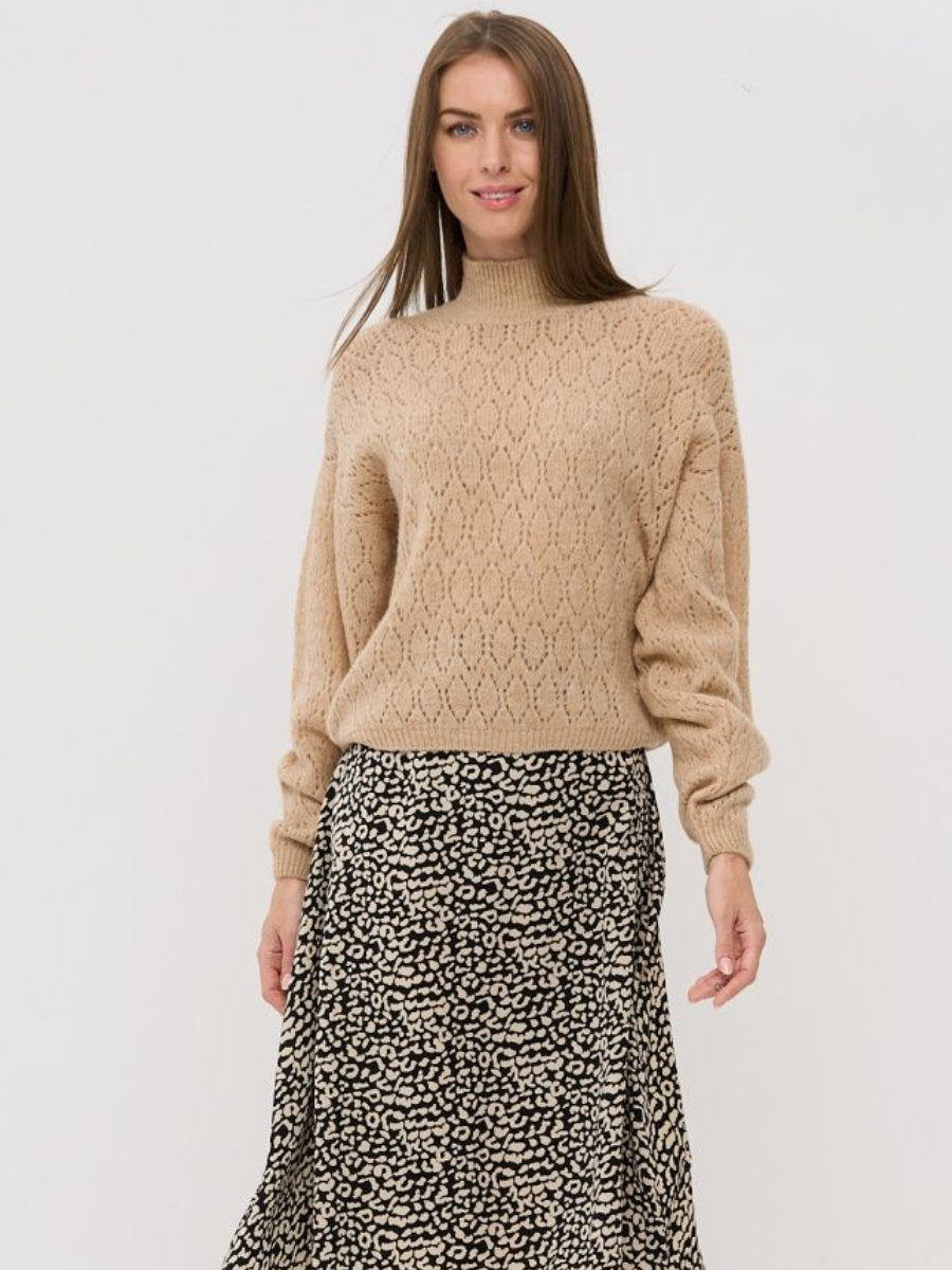 Модель в бежевом цвете. У этого свитера спущенное плечо и высокий ворот-стойка.