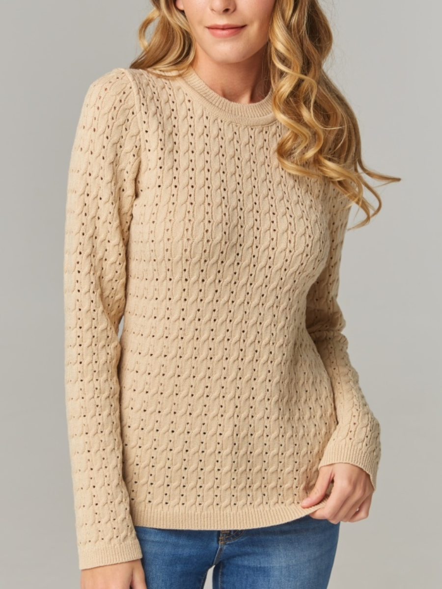 В этом свитере классического покроя теплого бежевого цвета чередуются тонкие жгуты (косы) и узкие полоски из лицевых петель с дырочками. Их разделяет одна изнаночная петля.