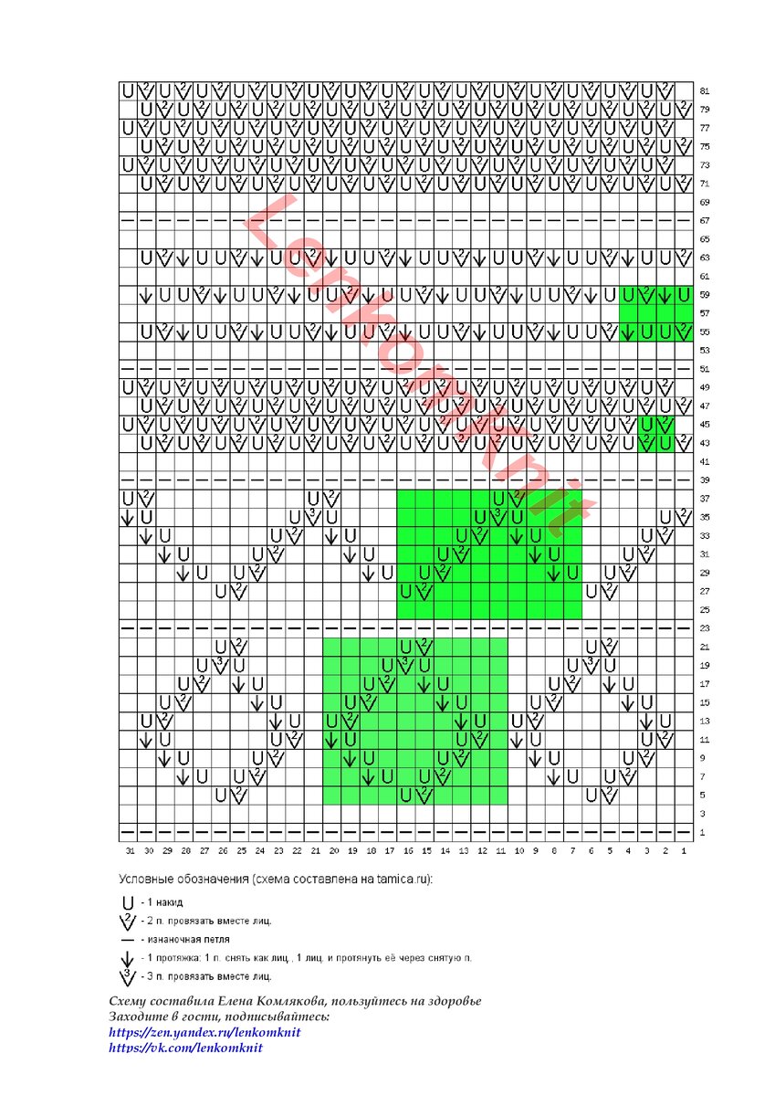 Схема всех узоров свитера - на рисунке (нечетные лицевые ряды). Зеленым цветом выделены раппорты каждого узора. Пустые клетки на этой схеме - лицевые петли.