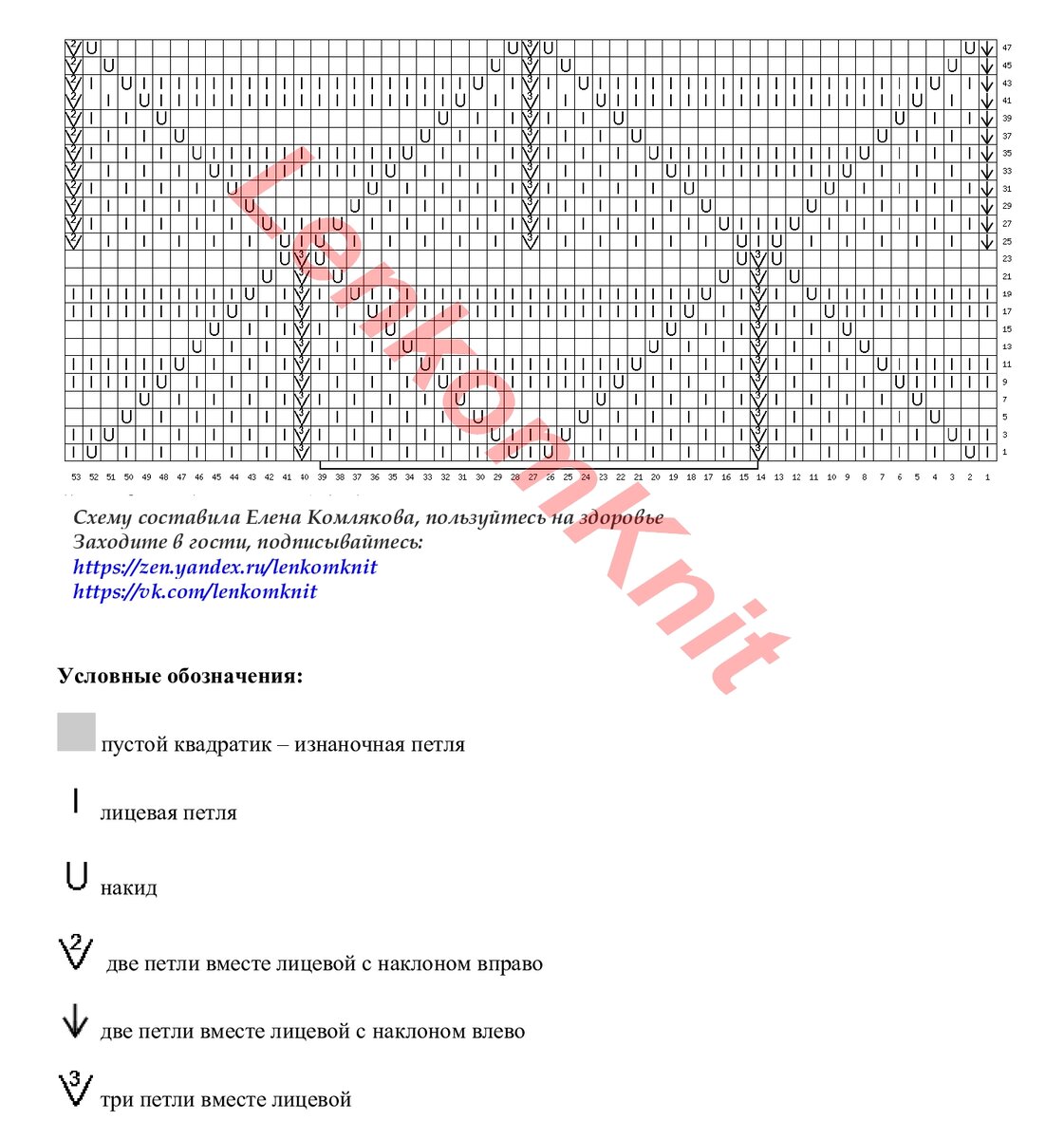 На схеме нарисован один раппорт узора в высоту (47 рядов). В ширину - начинаем вязать с 1 по 39 петлю, затем повторяем нужное количество раппортов (петли с 14 по 39) и заканчиваем петлями с 40 по 53 (для симметрии).