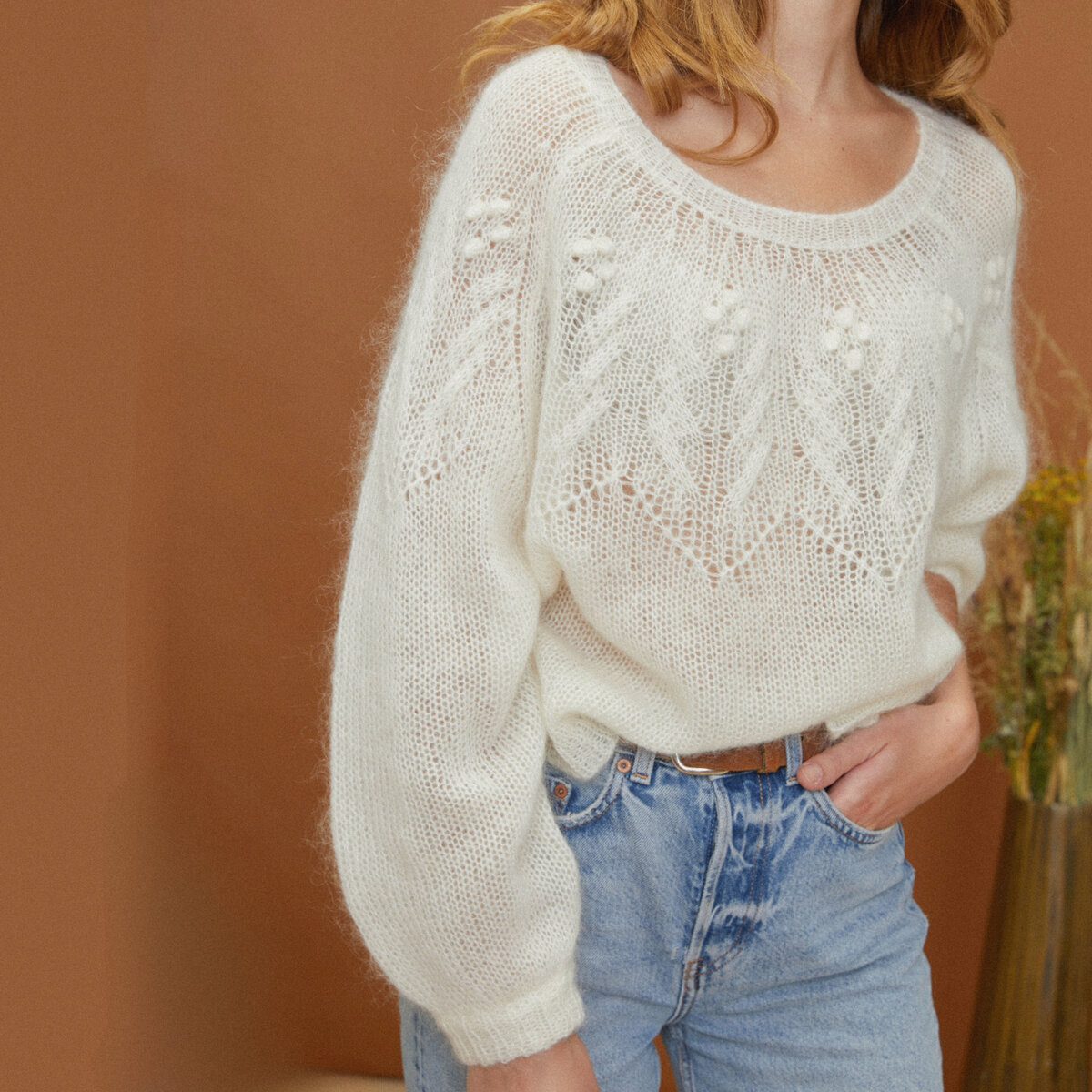 Изящная модель с рукавами реглан от бренда Trouva, выполненная лицевой гладью с симпатичным узором по кокетке, украшенным шишечками.