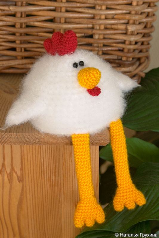 Обратите внимание, что пряжа, используемая для гребешка, ножек, клюва и бородки значительно тоньше, чем пряжа для вязания туловища и крылышек.