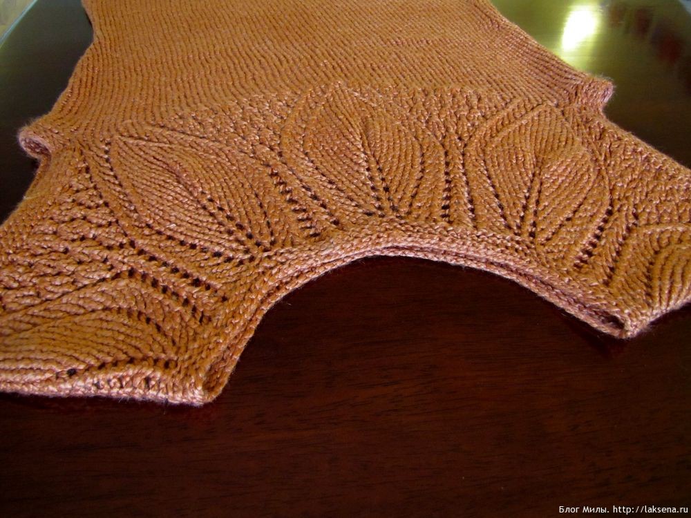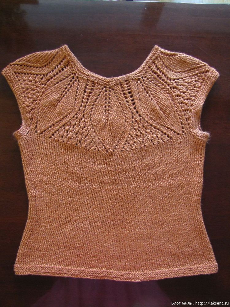 Вязаный топ на спицах «Листики» из шелковой пряжи — получился очень красивый с потрясающей кокеткой в виде листочков, с шелковым блеском, очень приятный в носке топ. Вяжется на круговых спицах сверху вниз.