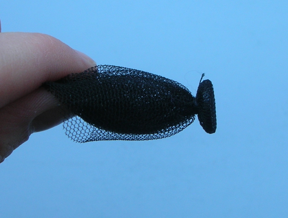 Как вы уже догадались,мы откладываем в стороны подготовленные заготовки из ленты и берёмся за заготовку из сетки. Отрезаем ,нужные нам по размеру,кусочки( или кусочек-если не хочется делать сердцевинку насыщенного цвета) и обтягиваем ими пуговку. Вот так