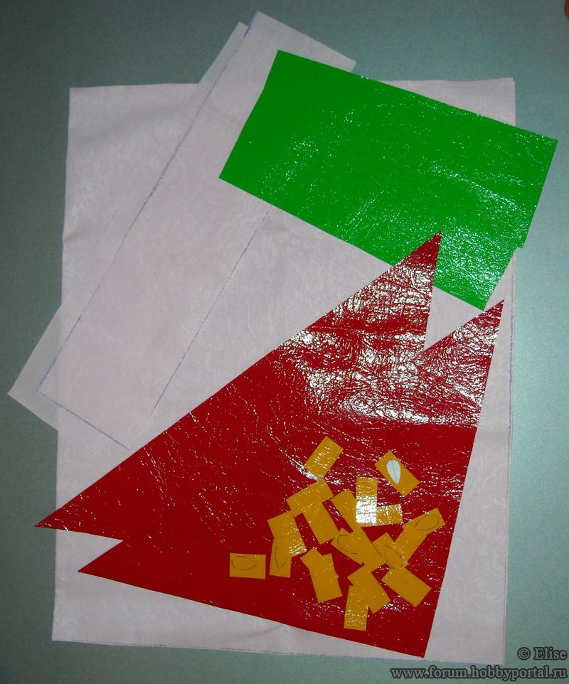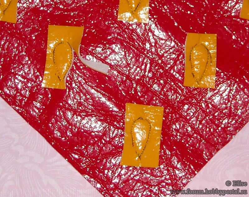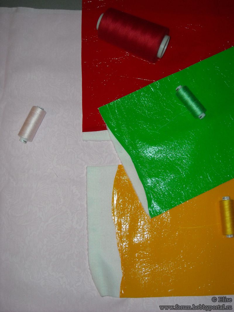 У меня получился этакий «гламурный» вариант - сумочка сшита из розового тика (собственно, х/б), лаке красного, желтого и зеленого цветов (совсем не х/б :D)