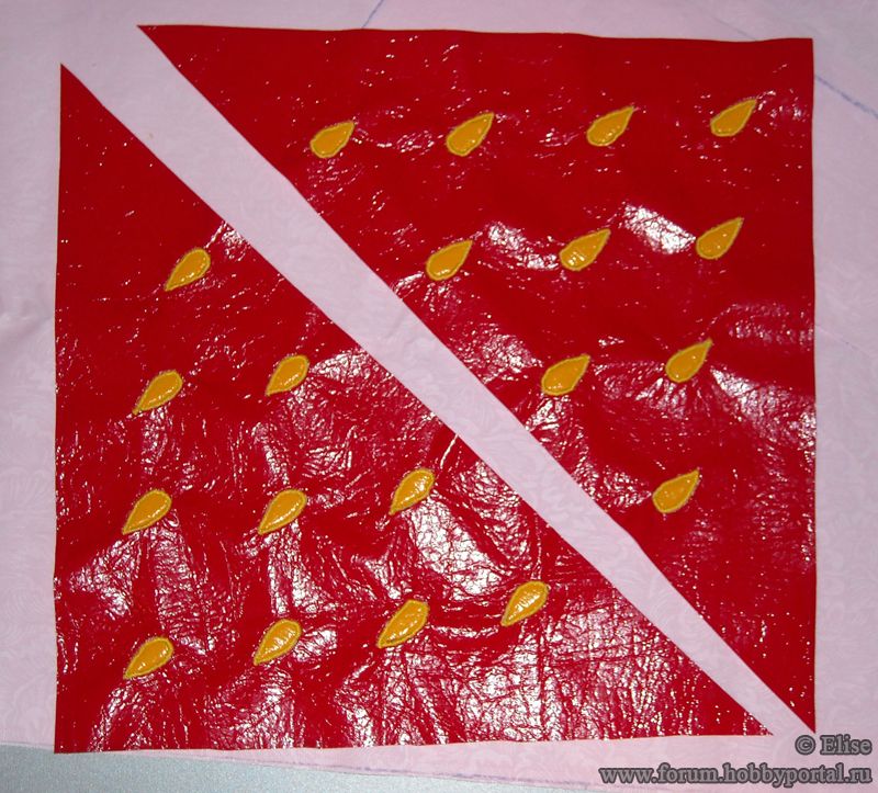 - Накладывам половинки клубнички на нижние углы лоскута 80х50 см (основа сумки) изнаночной стороной клубничек на лицевую сторону основы сумки и скалываем булавками.