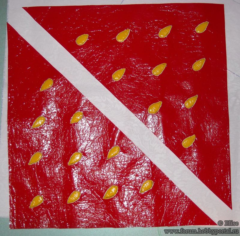 - Обводим шаблон на лоскутки для зернышек и размещаем заготовки на место, закалывая булавками.