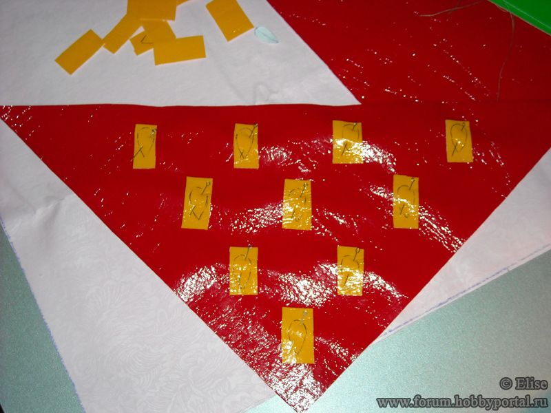 [показать] - Осторожно, не задевая булавок, настрачиваем по обведенному контуру шаблона каждое зернышко. Длина стежка 2 мм.