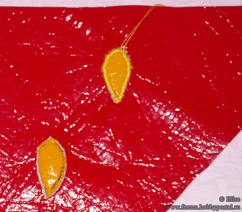 - материал для «зернышек» клубнички (лучше брать плотную, неосыпающуюся ткань; если все же решили взять сыпучую ткань, проклейте ее перед работой дублерином или флизелином), примерно 10х20см. У меня - лаке желтого цвета.