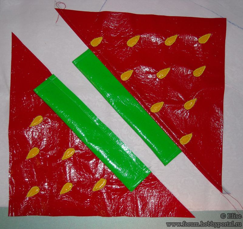 Я полагала, что лучше брать ткань красного цвета, но как показала практика в совместном пошиве сумочки, она смотрится эффектно практически в любом цвете. - 2 лоскута материала шириной 7 и длиной 26 см - для кулиски («хвостика» клубнички). У меня - лаке зеленого цвета.