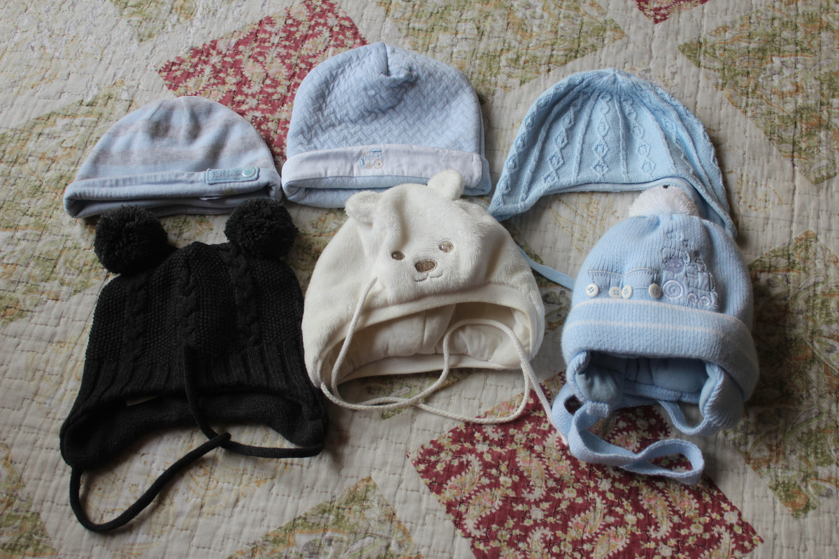 14. 6 шапок. В том числе, белая Kerry с утеплителем, размер 40, зимняя. Черная c помпонами H&M, на флисе, демисезонная, 0-2 мес.