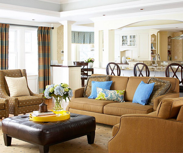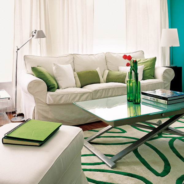 Основные акценты - зеленые (не темные, но и не бледные), дополнительные - желтые (по желанию). Лучше всего выглядит в гостиной светлых нейтральных тонов.