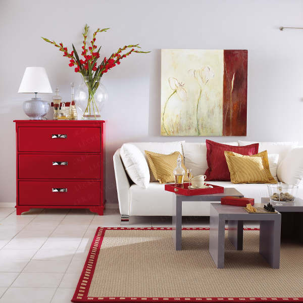 Ярко, празднично, изысканно. Красное непременно располагается рядом с белым. Эффектно в обстановке песочного, бежевого, светло-серого и тонов светлого дерева.