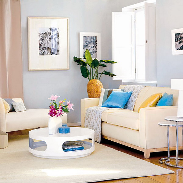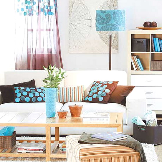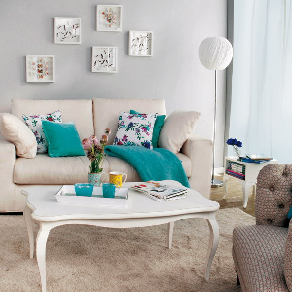 Ярко-бирюзовый. В паре мелочей или “разбросанный” по всей комнате. В сочетании с нейтральными тонами (белый, серый, коричневый) или с пастелью (нежно-розовый, ванильно-желтый).