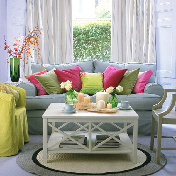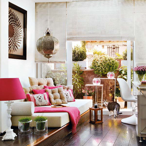 Два основных цвета в примерно одинаковой пропорции - ярко-розовый и сочный зеленый, разумеется, речь идет об акцентах. Если есть желание, - можно добавить желтый. Использовать эту идею лучше всего в сочетании с очень светлыми стенами и при отсутствии других ярких деталей.