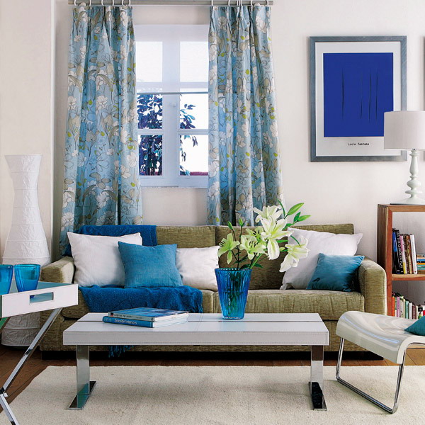 От светло-голубого до насыщенно-синего, лучше всего - несколько близких оттенков. Оптимально - в комнатах, где много белого. Масштабы - любые, поскольку синий цвет не считается агрессивным.