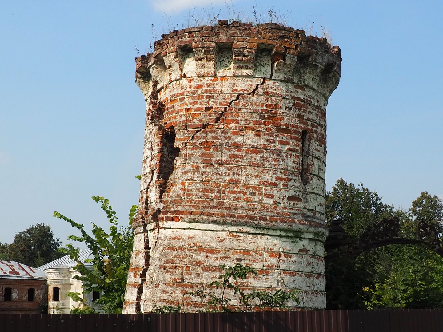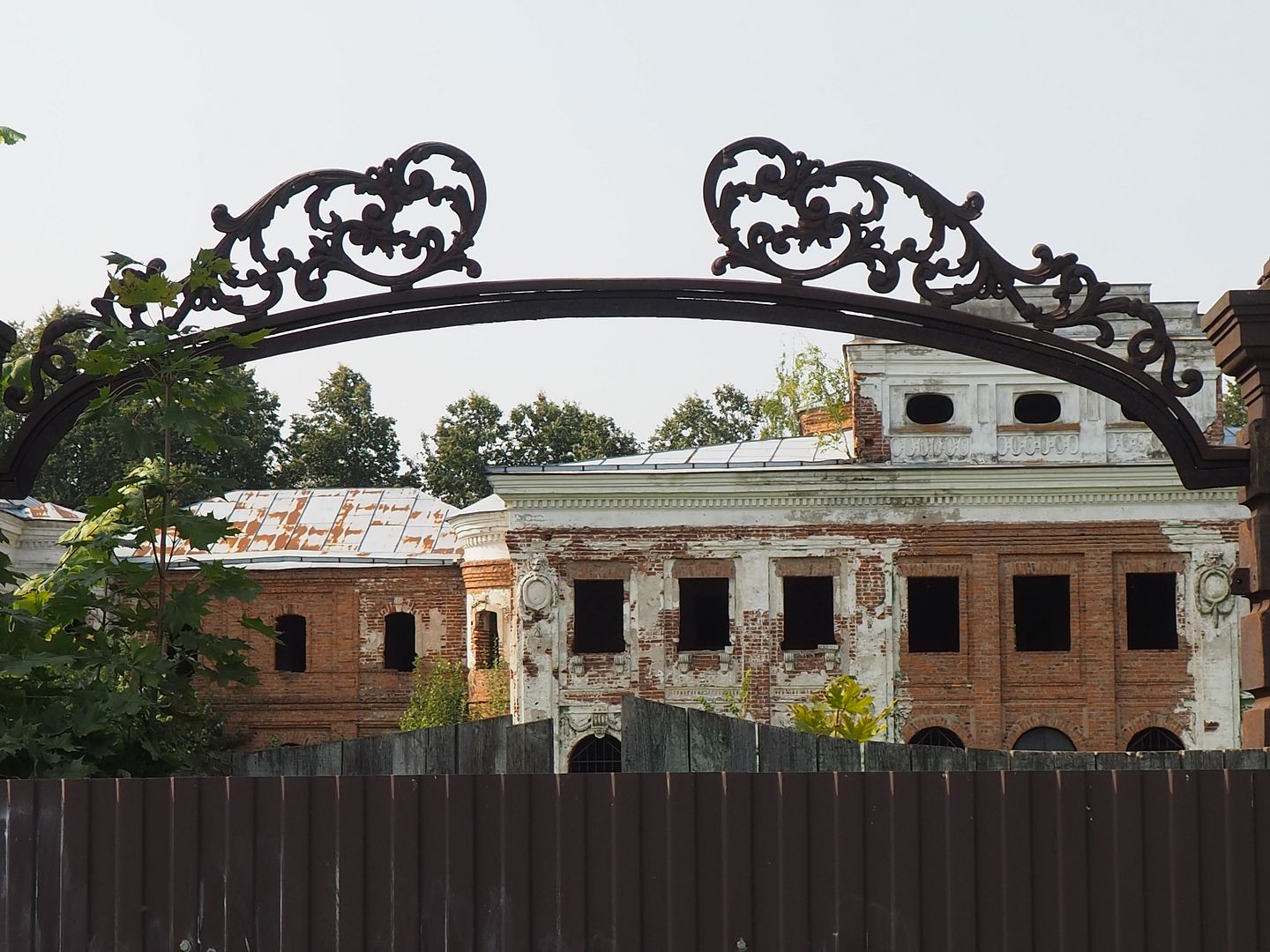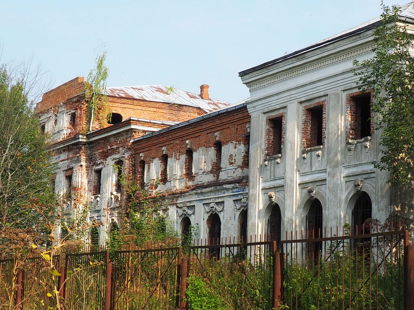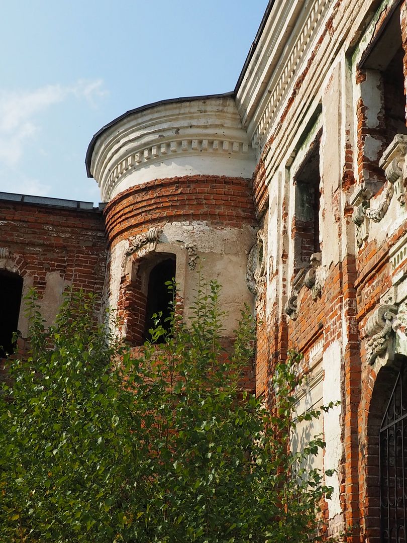 Сначала нам показалось, что внутрь не попасть никак, всё огорожено забором, со стороны дороги - совсем глухим, со всех остальных сторон - обычным, но всё же лазить через забор нам как-то было не с руки. Поэтому мы начали с фотографирования окрестностей, руин флигелей и потихоньку обходили забор вокруг.