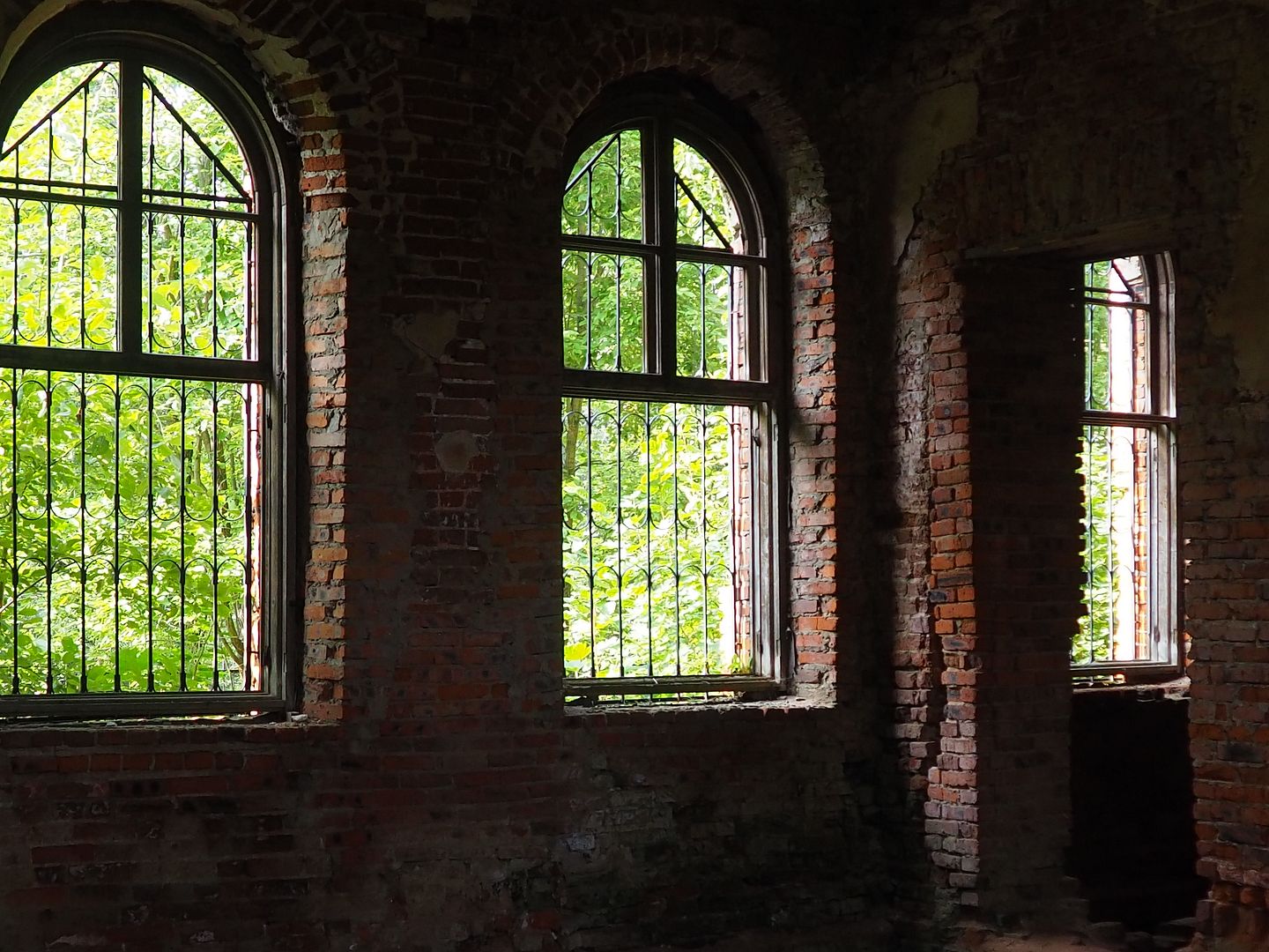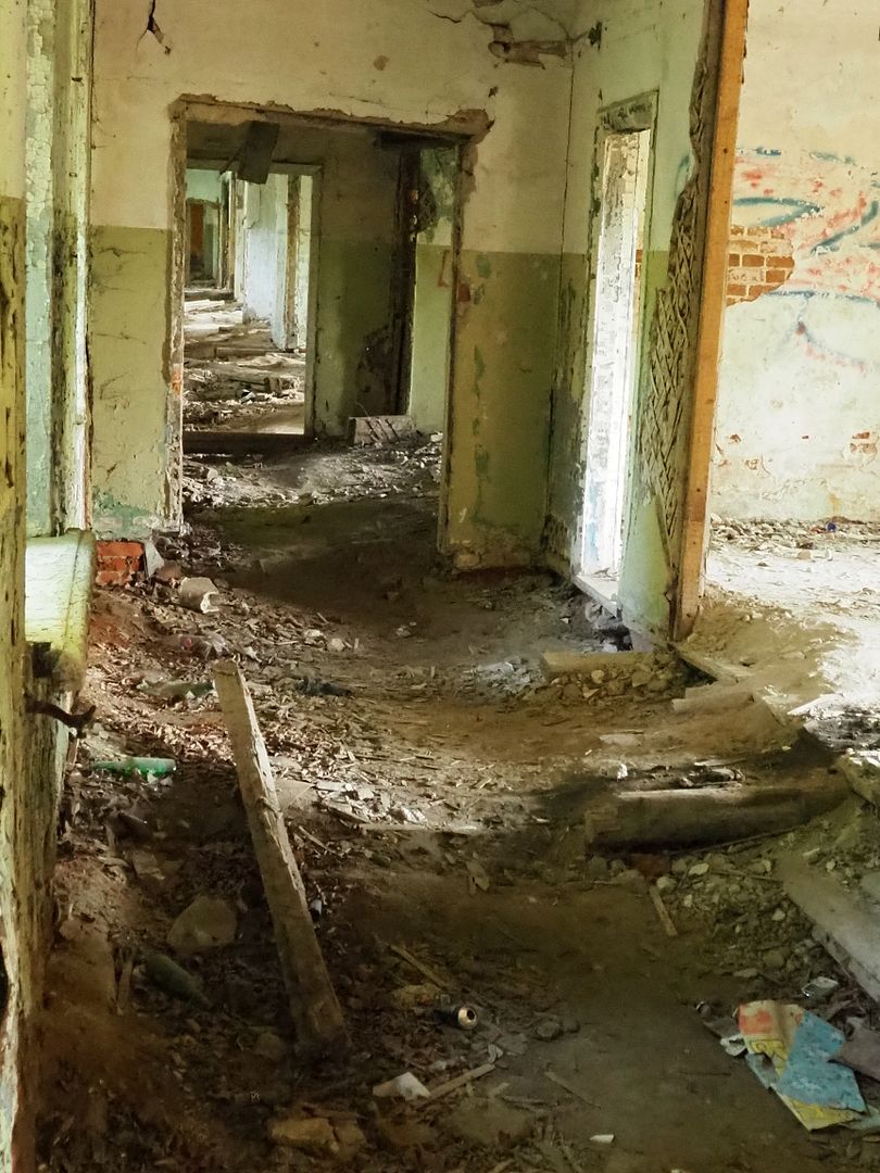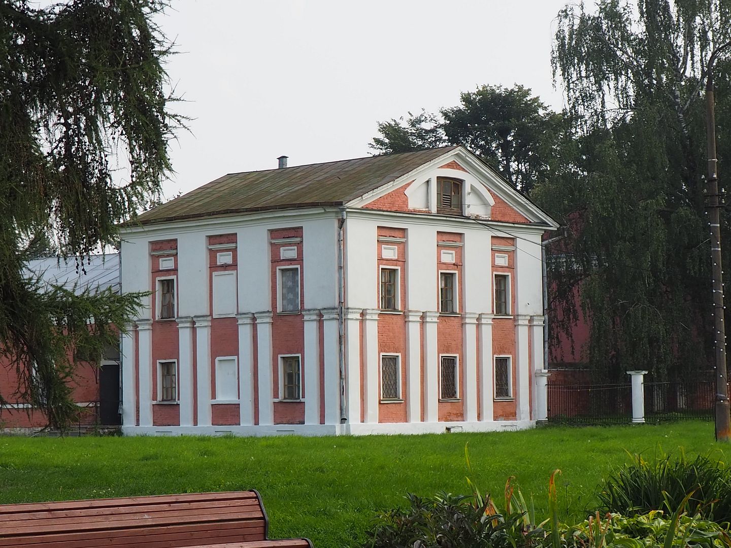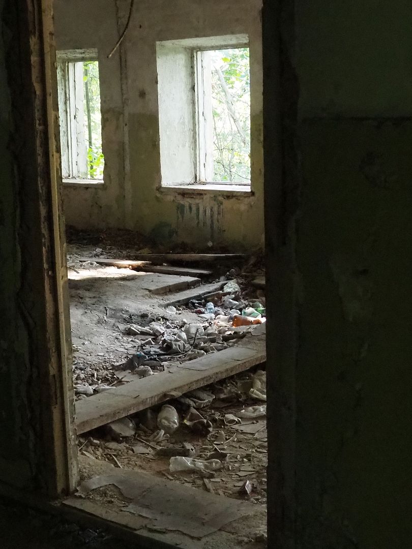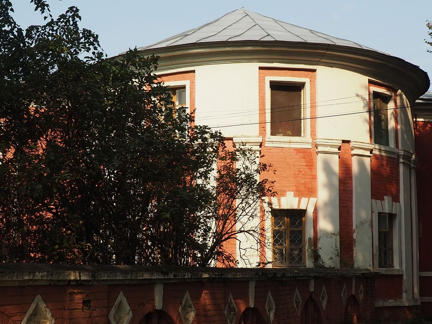 Сначала нам показалось, что внутрь не попасть никак, всё огорожено забором, со стороны дороги - совсем глухим, со всех остальных сторон - обычным, но всё же лазить через забор нам как-то было не с руки. Поэтому мы начали с фотографирования окрестностей, руин флигелей и потихоньку обходили забор вокруг.