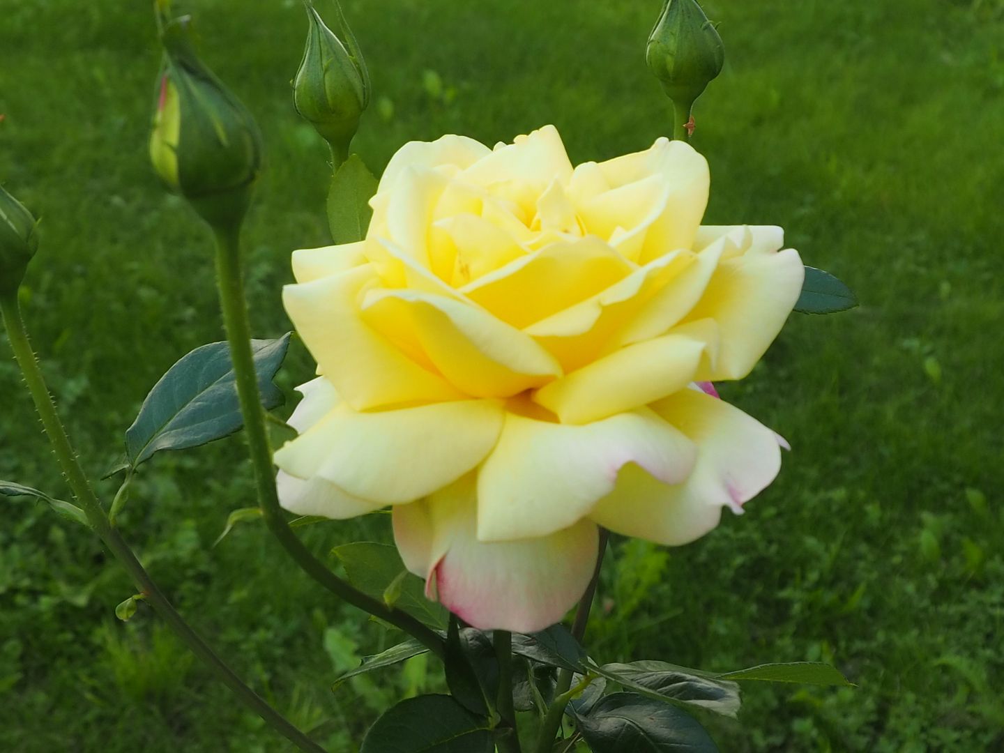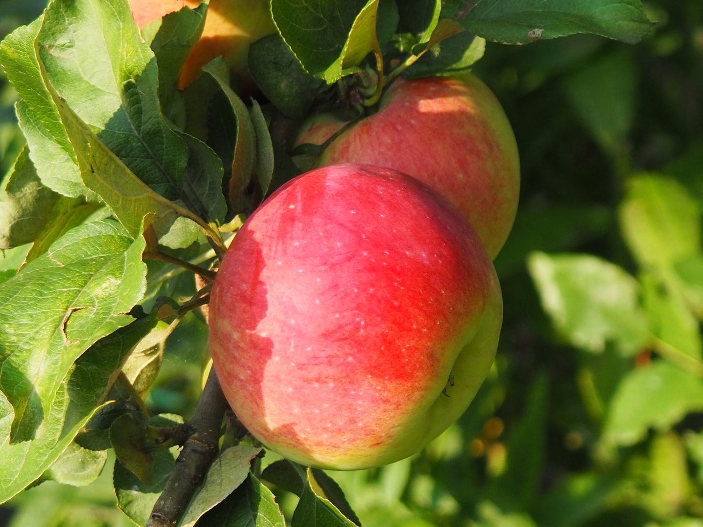 На территории очень зелено, много цветов и яблонь.