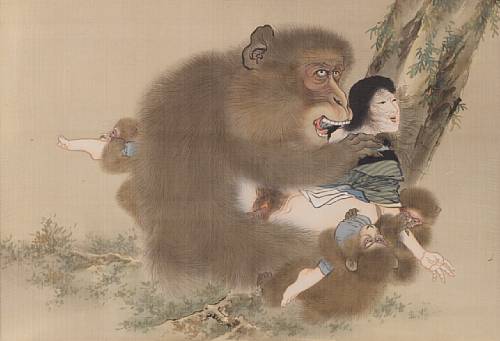 A nikuhitsu shunga makimono, mounted with twelve erotic scenes with domesticated and wild animals and creatures endowed with supernatural powers, in ink and colour on silk, signed with seal Sensai; with double wood storage boxes, the cover of one box painted with Autumnal grasses in contrasting tones of gold by Mano Gyotei (1874-1934), the pupil of Kawanabe Gyosai (1831-1889), signed in gold Gyotei with seal Gyotei. Each painting approx. 26.7cm x 39cm (10½in x 15 3/8in), total length 26.7cm x 639cm (10½in x 25 5/8in). (3).