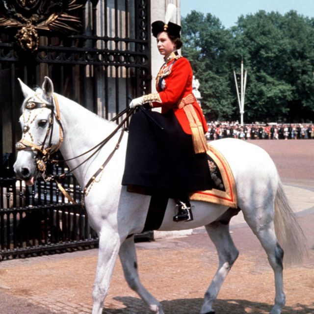 За две недели до смотра королева сама начинает тренироваться в верховой езде, сидя в дамском седле, как в дни юности, и этим тренировкам она посвящает каждое утро по два часа.По возвращении в Букингемский дворец она по традиции дает своей лошади морковку и выпивает бокал шампанского, прежде чем появиться на балконе в окружении членов семьи, в то время как в небе самолеты устраивают свой «воздушный балет».