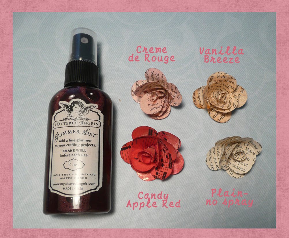 11.  Как только клей высохнет, вы готовы добавить цвет к вашему цветок.Я использовал Glimmer Мист потому что я люблю мягкие цвета и мерцание этот продукт добавляет к цветамНо какие-либо аэрозоли-на краситель будет работать. Просто не забудьте проверить его на образец бумаги, поскольку интенсивность цвета меняется от бренда к бренду. Изображенный выше, некоторые цвета, которые я использовал при создании моего бумажные розы.  Так же можно попробовать применения цвета, прежде чем положить цветок вместе для другой вид.