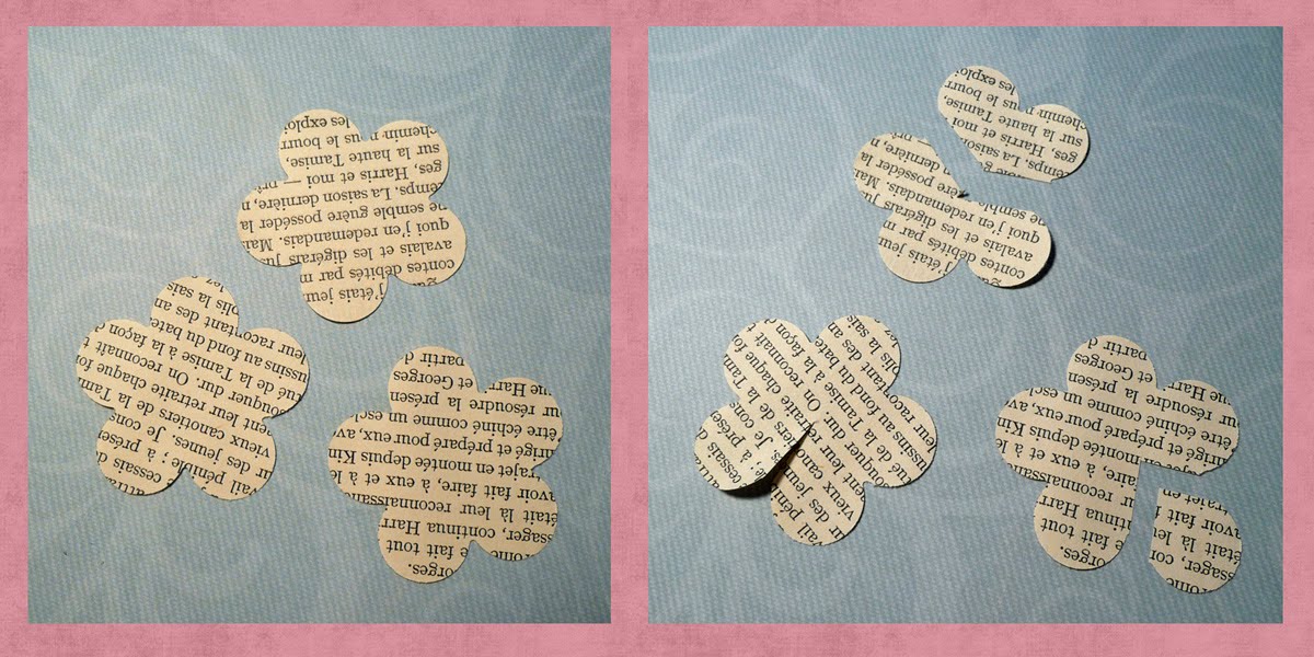 1. Для каждого бумажный цветок вам нужно пробить 3 цветы из страниц старой книги. Использование ножницы, вырезать цветы, как показано на фото справа вверху.  Повесьте на все части цветка, потому что мы будем использовать все из них.