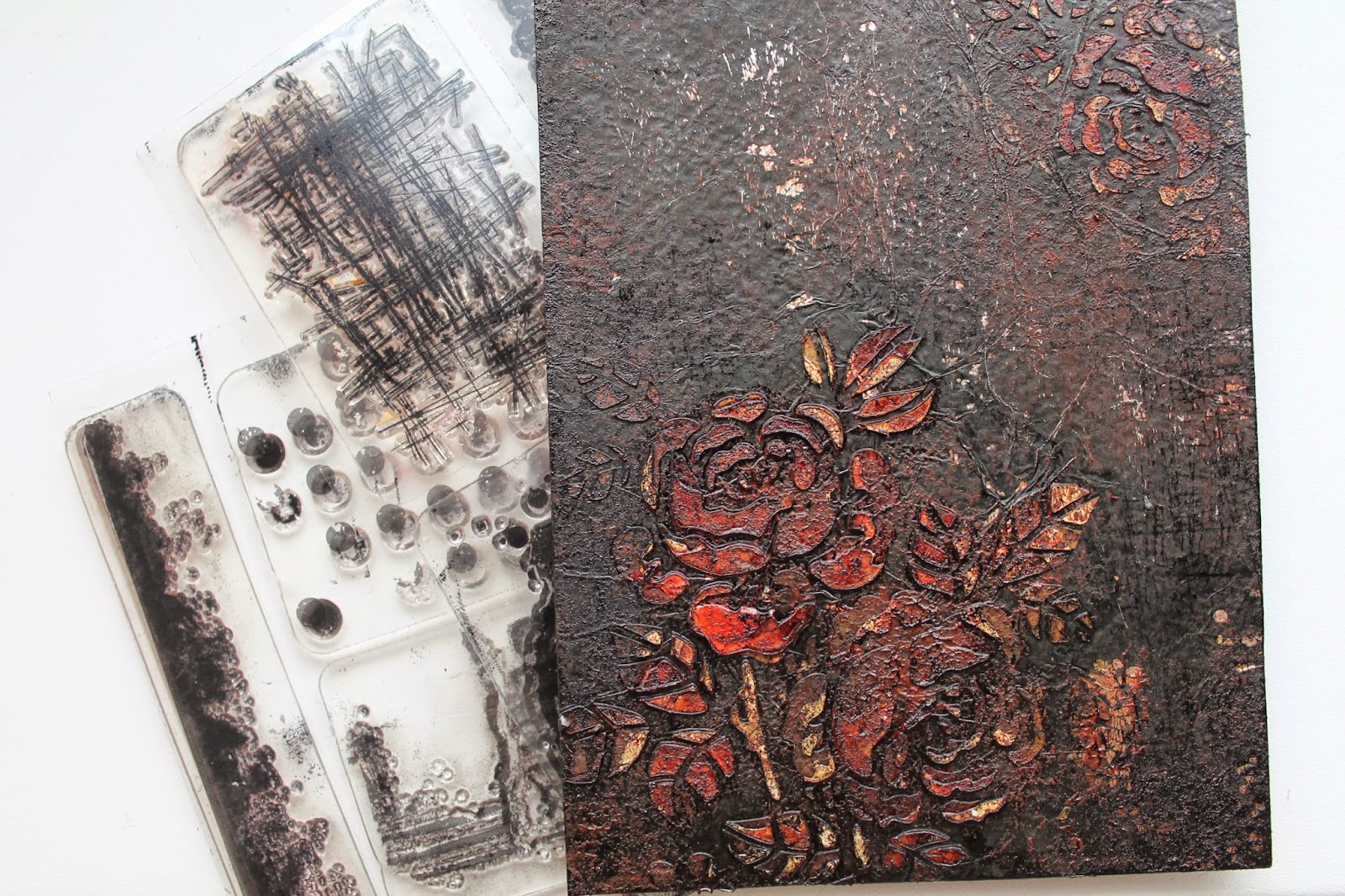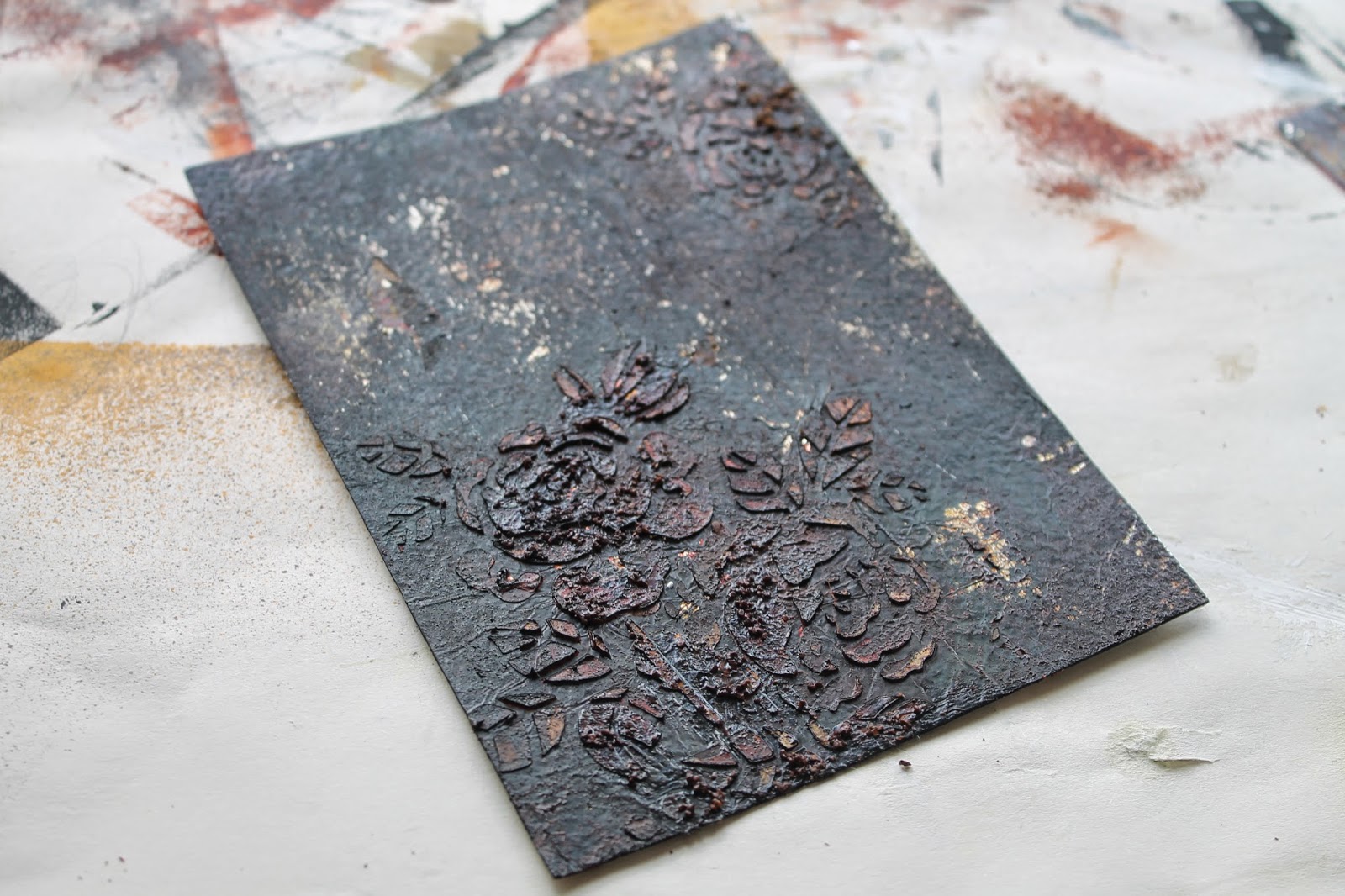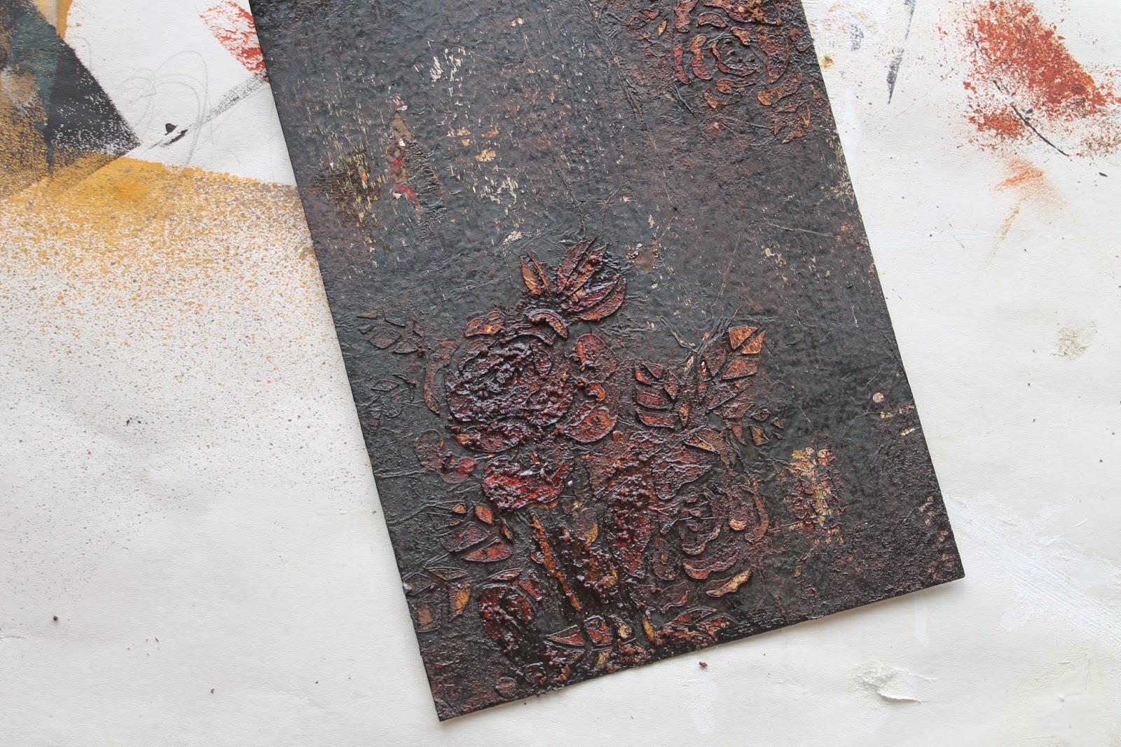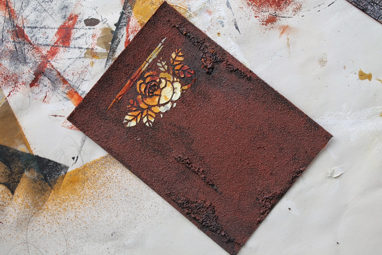 Здесь сначала был прозрачный эмбоссинг, закрашенный впоследствии с помощью губки сиеной - получились вот такие интересные ржавые пупырышки. Добавила немного алкогольных чернил оттенка Rust.