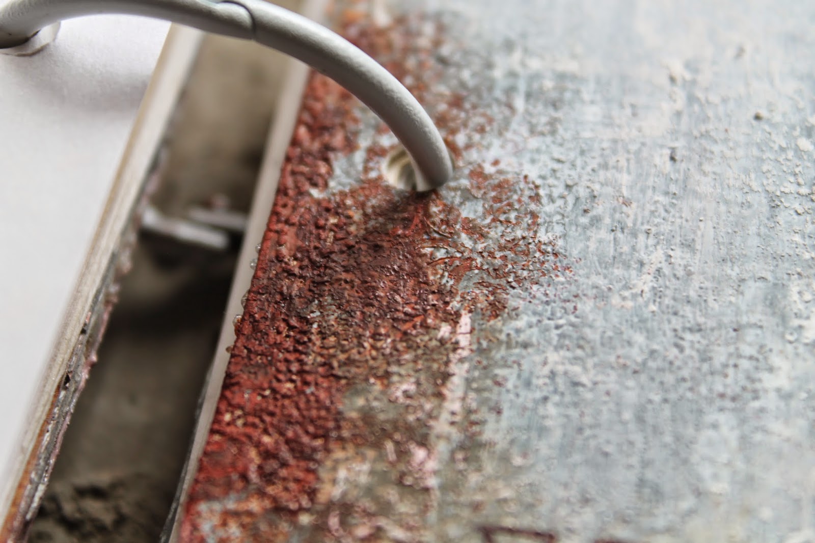 Затем закрашиваю фон акриловой краской, которая, на мой взгляд, по своему оттенку ближе остальных к натуральной ржавчине. Называется она сиена жженая. Я сознательно не стараюсь делать фон равномерно коричневым - пусть сквозь коричневый проглядывают темные участки наждачки: цветовые нюансы "темнее/светлее" делают фон интереснее, а главное реалистичнее.