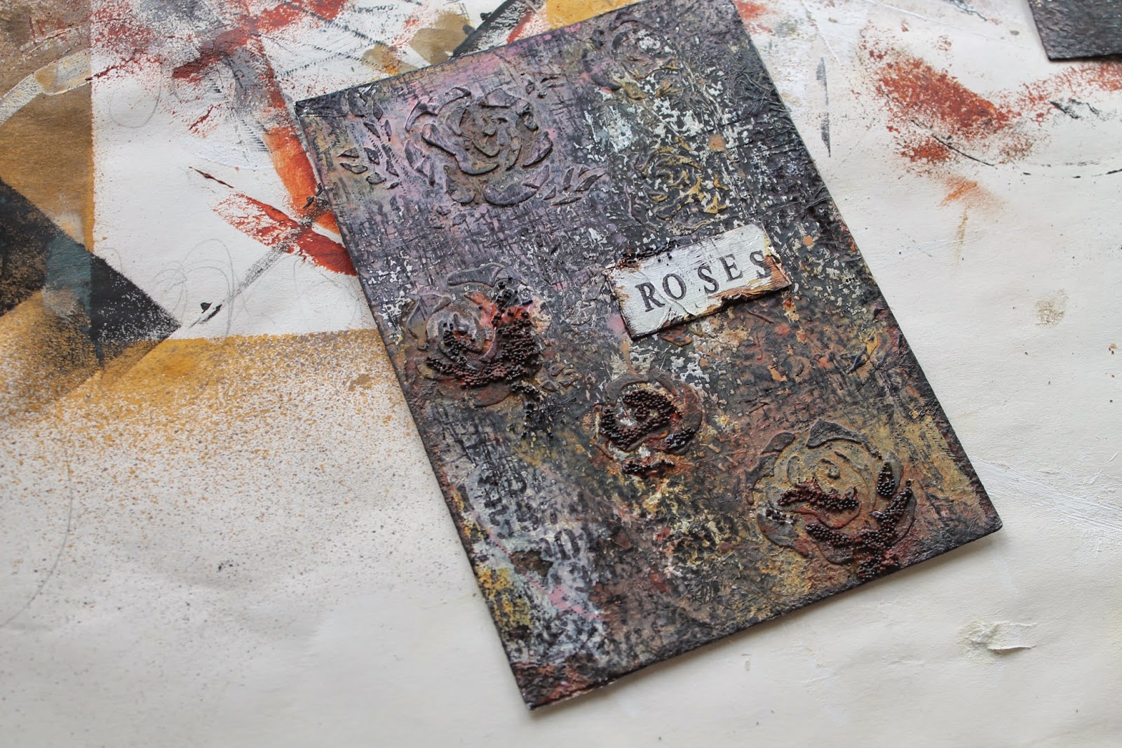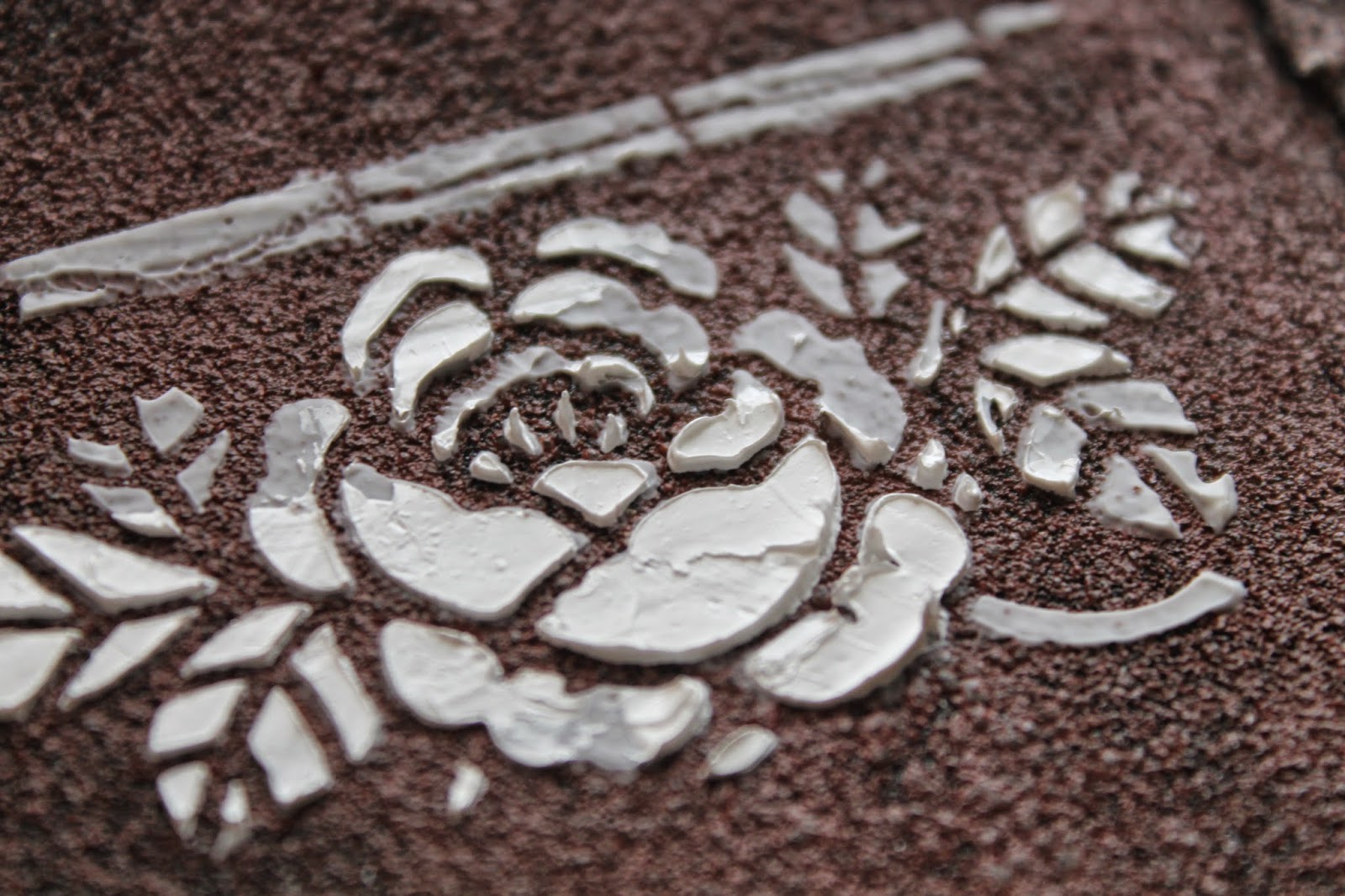 Фон практически готов. Мне сразу же захотелось посмотреть, как на нем будут смотреться трафареты. Наношу рисунок розы - сначала текстурной пастой, а затем (в некоторых местах, не убирая трафарет) - хорошо загустевшим белым акриловым грунтом .