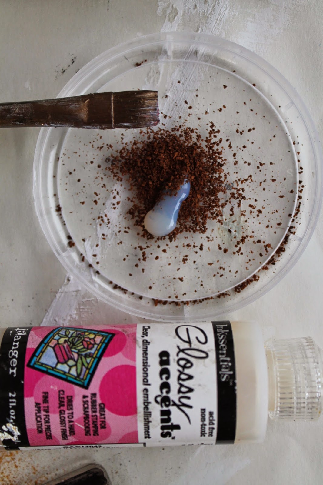 Потом мне захотелось добавить выступающей, фактурной ржавчины на цветы. Губкой с краской я решила этого не делать - рисунок мог потерять четкость, а это не входило в мои планы. Работать надо было локально-экспериментально, и я подумала: "А не попробовать ли кофею?" Беру кисточку, молотый кофе и глосси-акцентс.