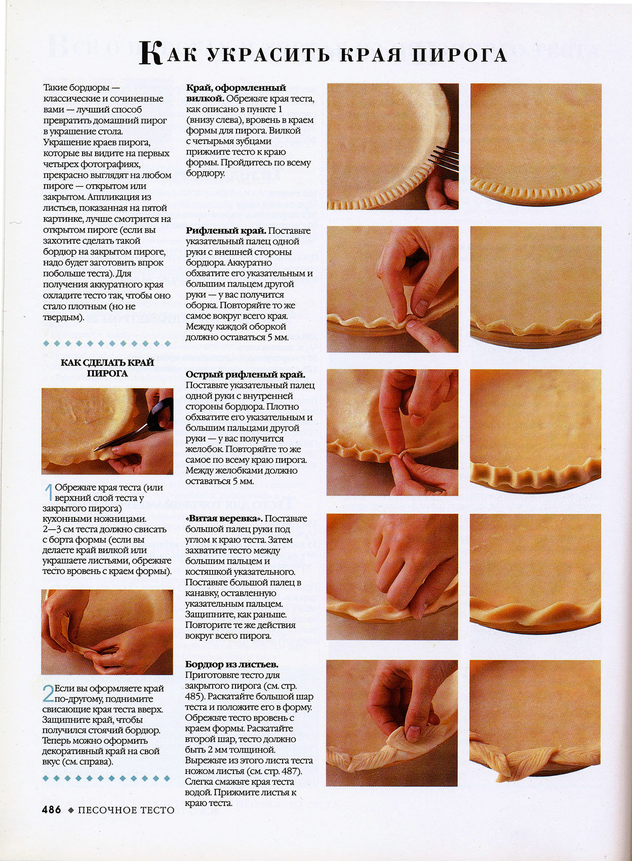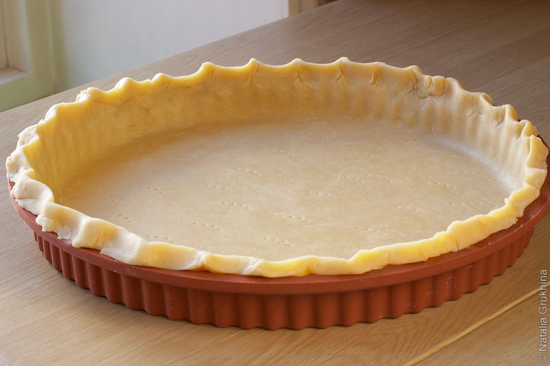 4. Выкладываем тесто на стол, присыпанный мукой, и раскатываем скалкой так, чтобы получился круг диаметром на 5 см. больше, чем форма для выпечки. Затем накручиваем тесто на скалку, осторожно разворачиваем на форму и прижимаем пальцами так, чтобы тесто заняло всю форму.Накалываем дно теста вилкой, чтобы оно не поднялось в процессе выпечки. Края теста подворачиваем внутрь и формируем бортик высотой 5-7 мм. Советы как красиво оформить край пирога;