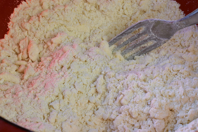 1. Готовим песочное тесто: смешиваем муку, соль и порезанные на кубики маргарин и масло. Измельчаем при помощи вилки или ножа до тех пор, пока смесь не превратится в крупные крошки;