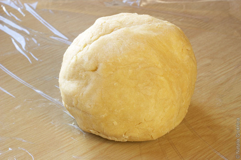 3. Заверачиваем тесто в полиэтиленовую пленку и кладем в холодильник на 30 минут. Тесто можно оставить и на всю ночь, в этом случае достаньте тесто заранее и дайте ему полежать при комнатной температуре 30 минут;
