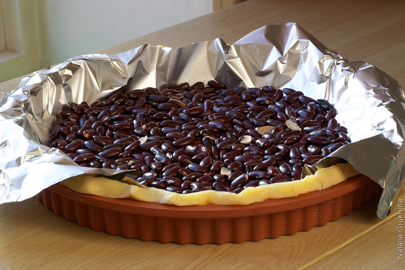 5. Застилаем тесто сверху фольгой и насыпаем на нее сухую фасоль, горох или специальные шарики для выпечки. Это необходимо, чтобы тесто не поднялось и не перекосилось;