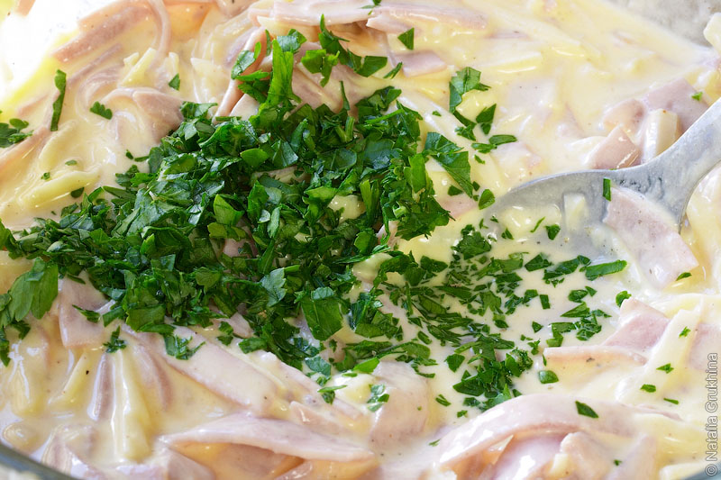 7. Тем временем готовим начинку: нарезаем ветчину тонкими полосками, сыр натираем на крупной терке, смешиваем и добавляем яица, крем-фреш и сливки. Добавляем специи и зелень, солим и перчим;