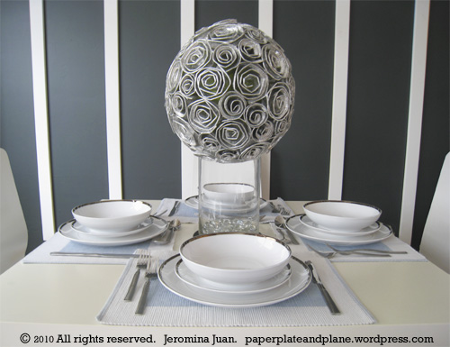 ЧТО ПОТРЕБУЕТСЯ: различные абажурные каркасы белого цвета; толстый нейлоновый шнур; подсвечники и белые свечи для новогодней елки; стеклянные шары; серебристые шишки и шары.