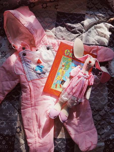 На месяц Бабушка и Дедушка надарили тебе сказки Пушкина и наказали мне их тебе читать (а мне самой милее Муха-цокотуха, мой папа мне ее читал бесконечное количество раз, до сих пор наизусть помню), милую зайку и... комбинезончик, который я носила будучи такой же малышкой как ты! Уже не терпится примерить его на тебя :) не верится, что спустя четверть века вещь может быть такой мягонькой и уютной