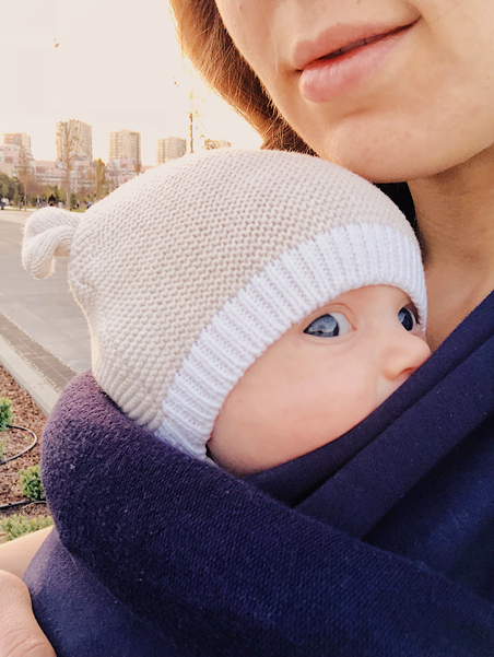 Наряд получился странный, просто это единственная шапочка что у нас есть на завязках, все остальное - гномьи колпачки. Надо купить и темную шапочку под слинг :) И наверное шерстяные мини-носочки, мы гуляем до глубокой темноты и ее ножки по приходу домой каждый раз как льдышки...